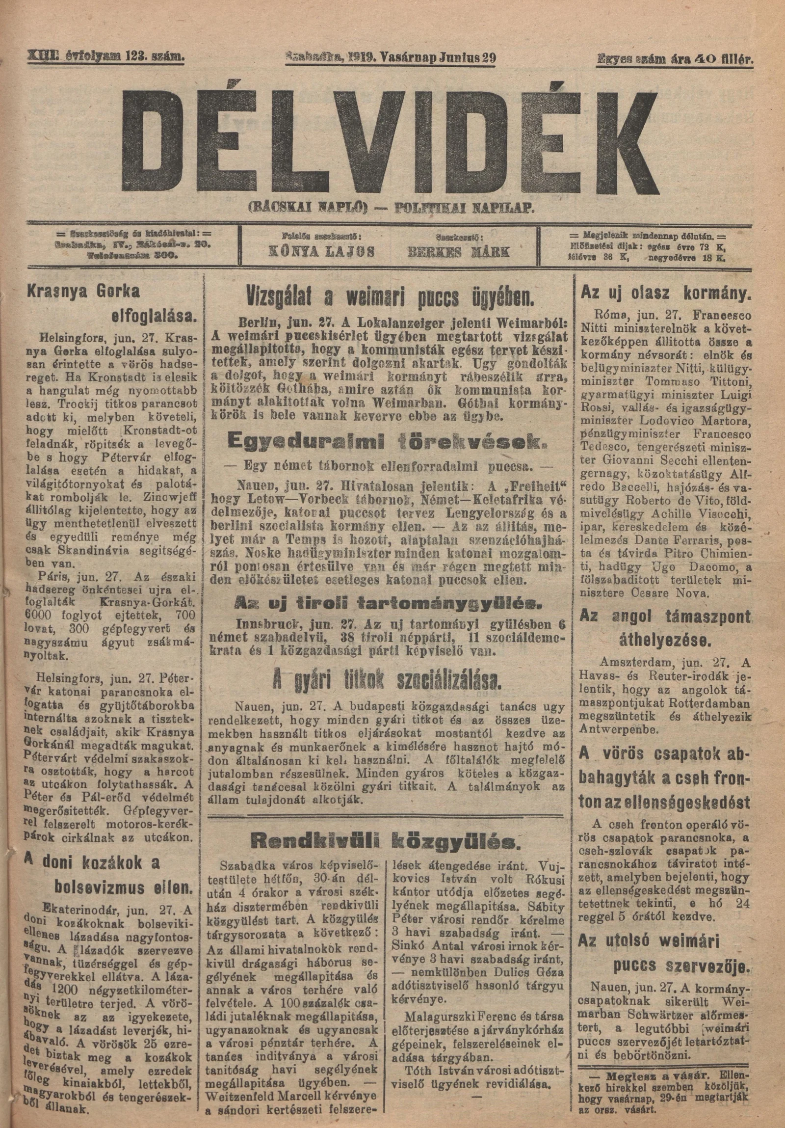 Délvidék, 13. évf. 1919. június 29. 123. sz.