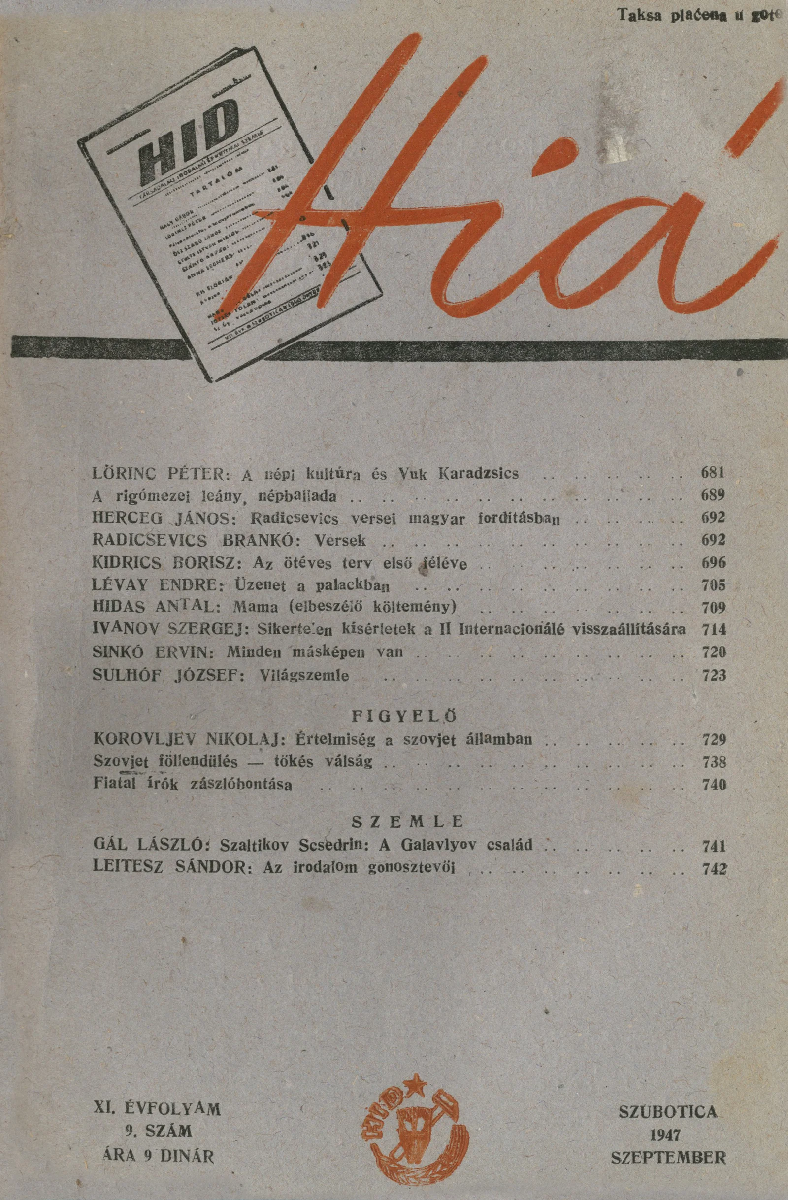 Híd, 11. évf. 1947. szeptember 9. sz. 681–744.