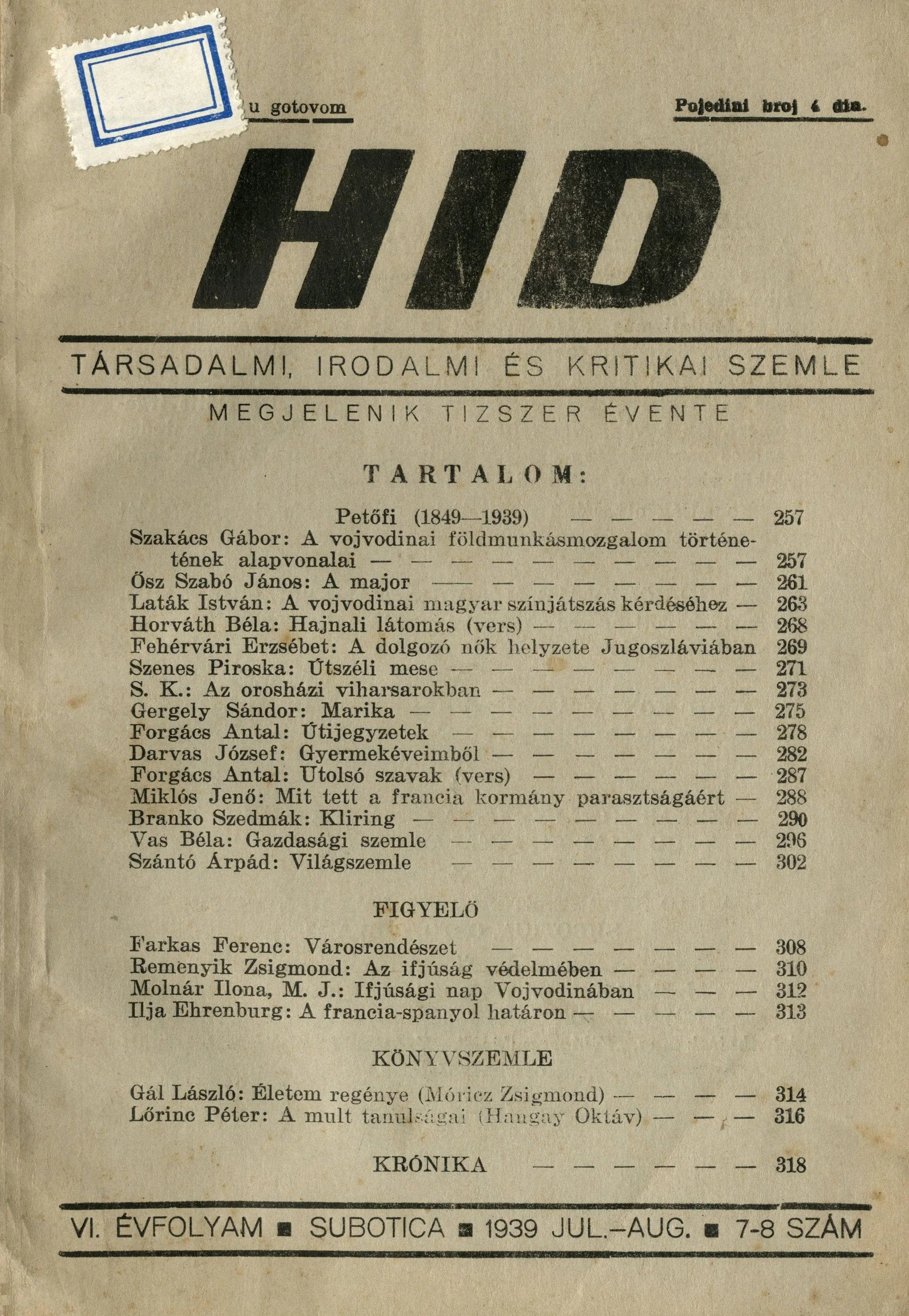 Híd, 6. évf. 1939. július-augusztus 7–8. sz. 257–320.
