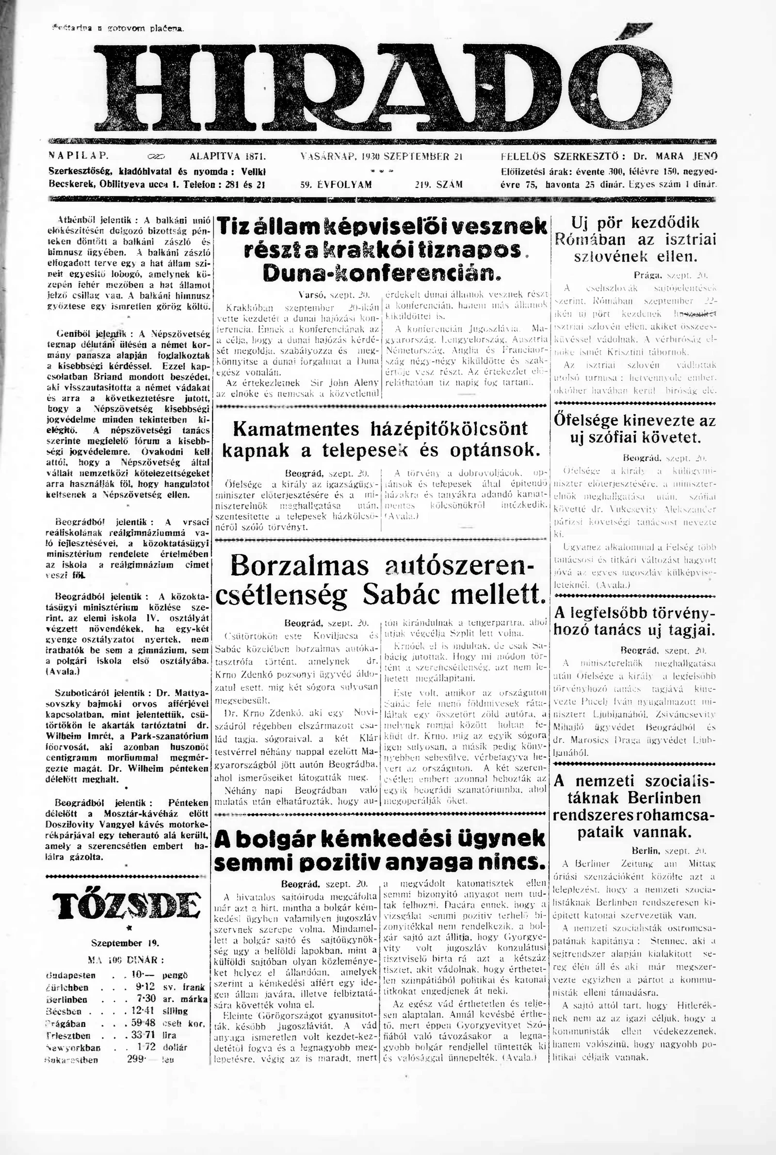 Híradó, 59. évf. 1930. szeptember 21. 219. sz.