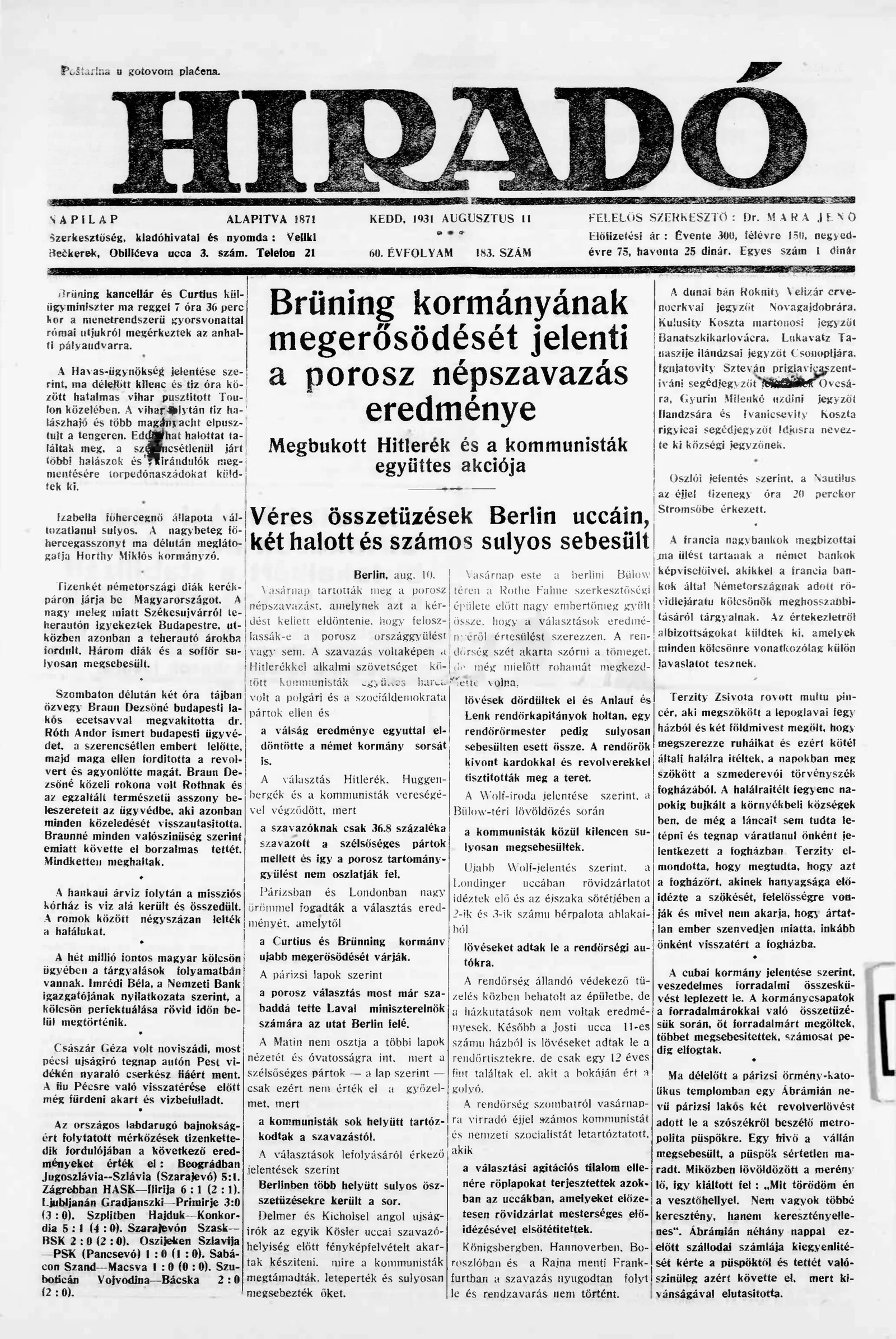 Híradó, 60. évf. 1931. augusztus 11. 183. sz.