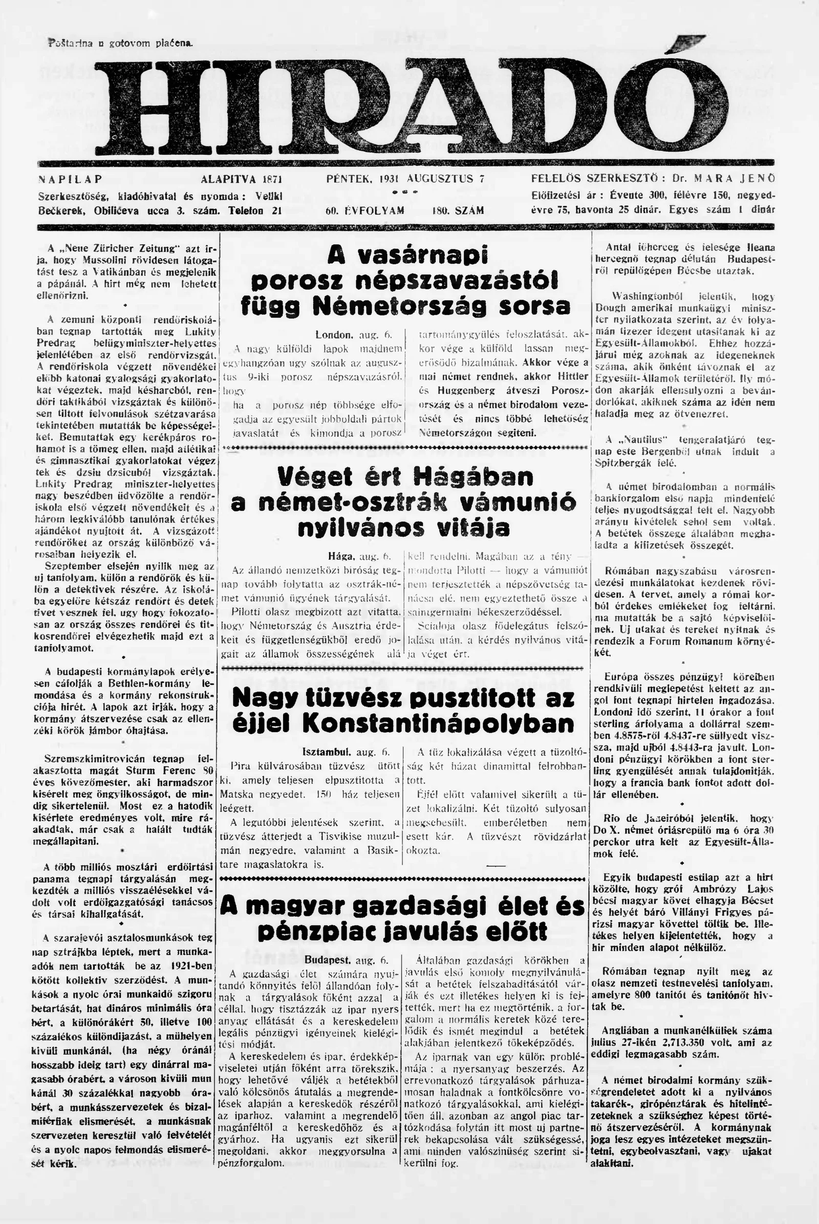 Híradó, 60. évf. 1931. augusztus 7. 180. sz.