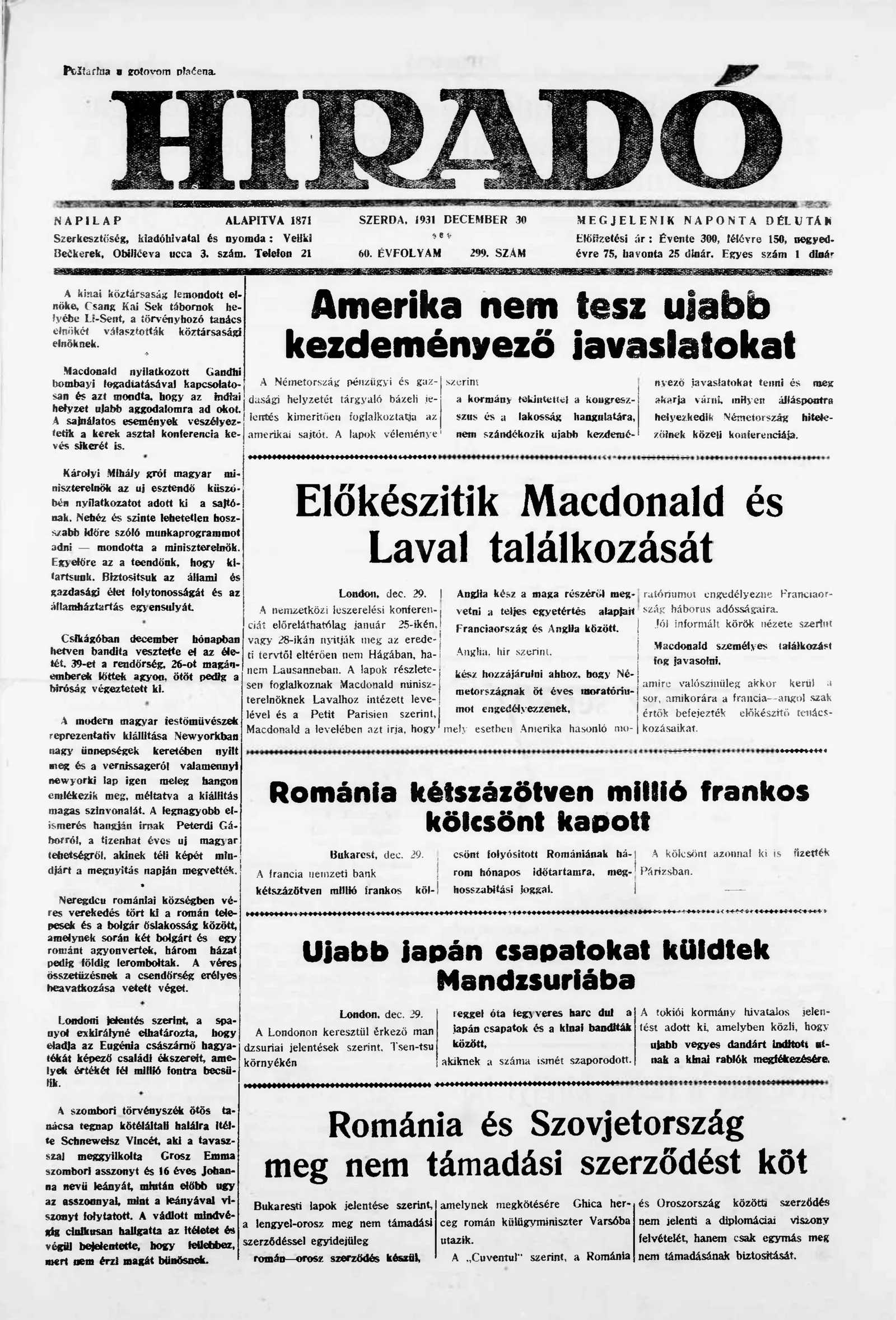 Híradó, 60. évf. 1931. december 30. 299. sz.