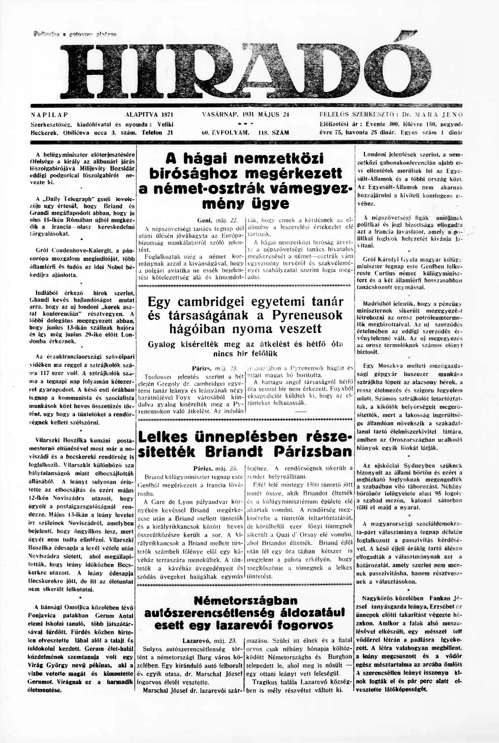 Híradó, 60. évf. 1931. május 24. 118. sz.