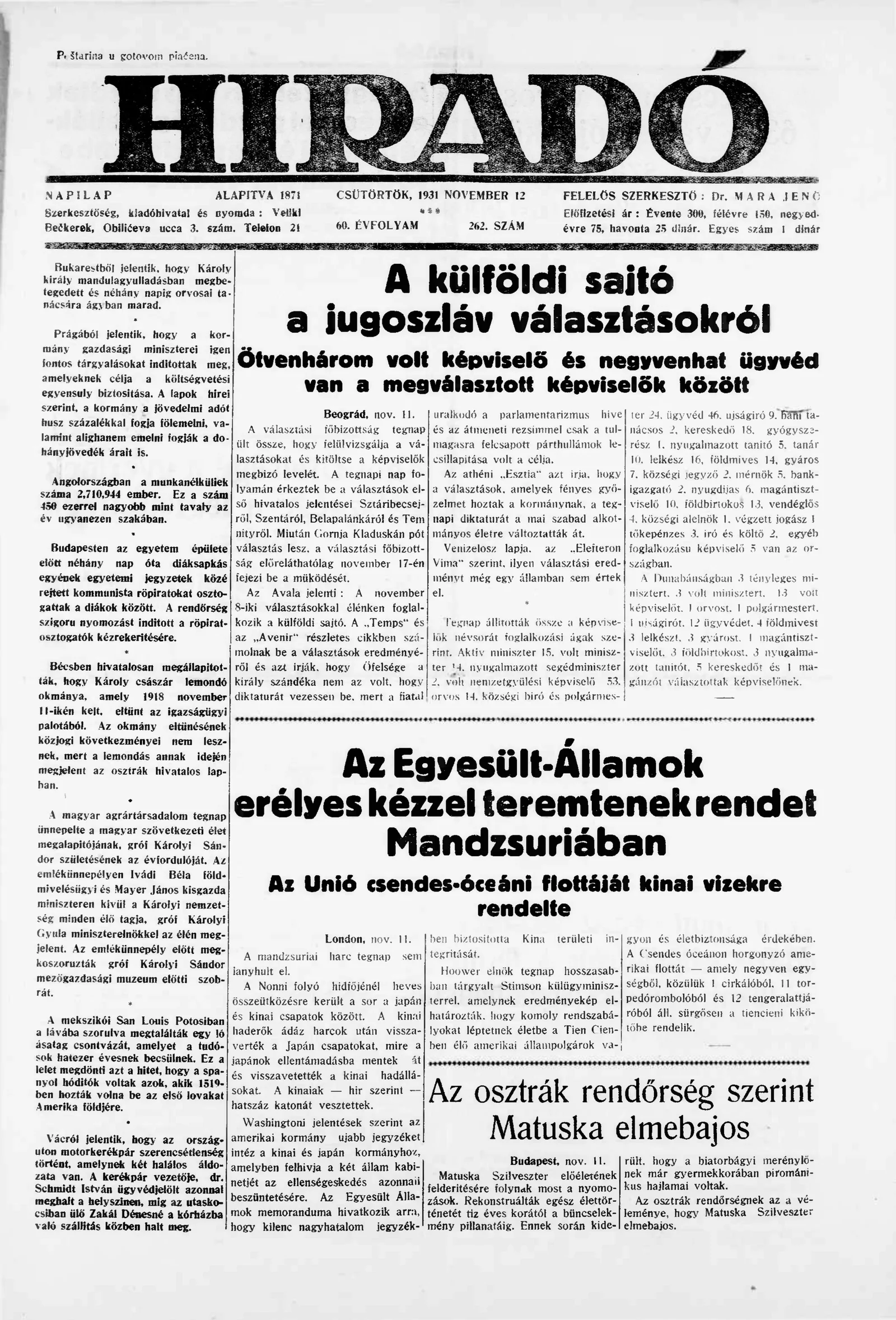 Híradó, 60. évf. 1931. november 12. 262. sz.