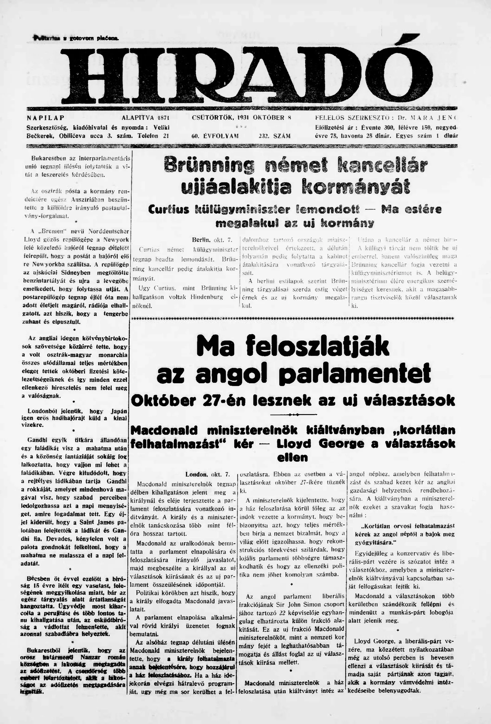 Híradó, 60. évf. 1931. október 8. 232. sz.