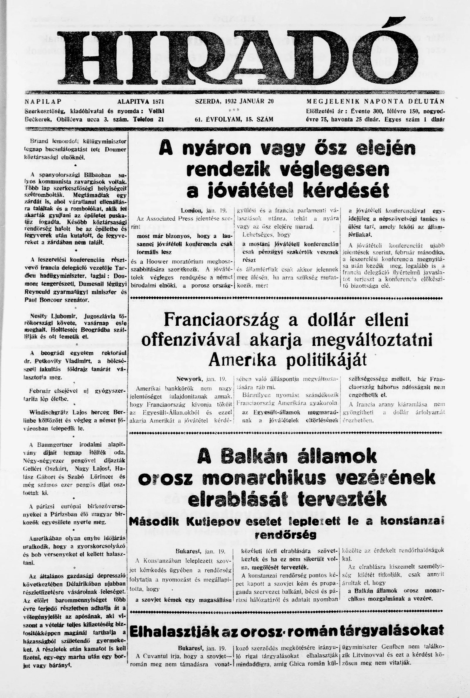 Híradó, 61. évf. 1932. január 20. 15. sz.