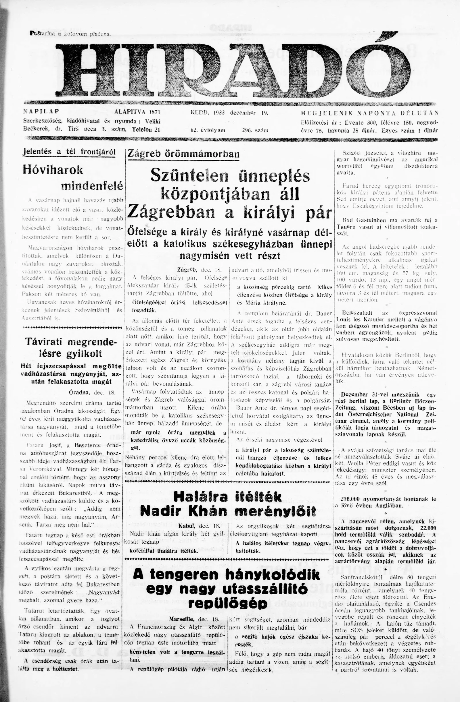 Híradó, 62. évf. 1933. december 19. 296. sz.