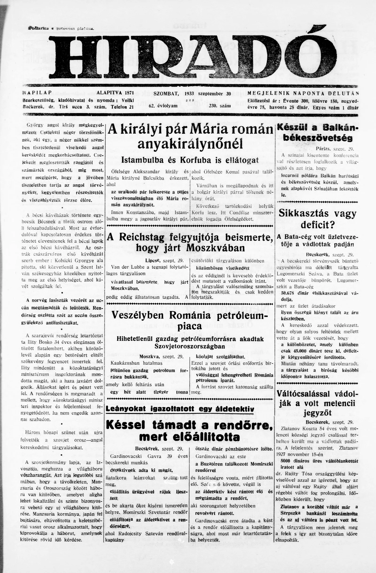 Híradó, 62. évf. 1933. szeptember 30. 230. sz.
