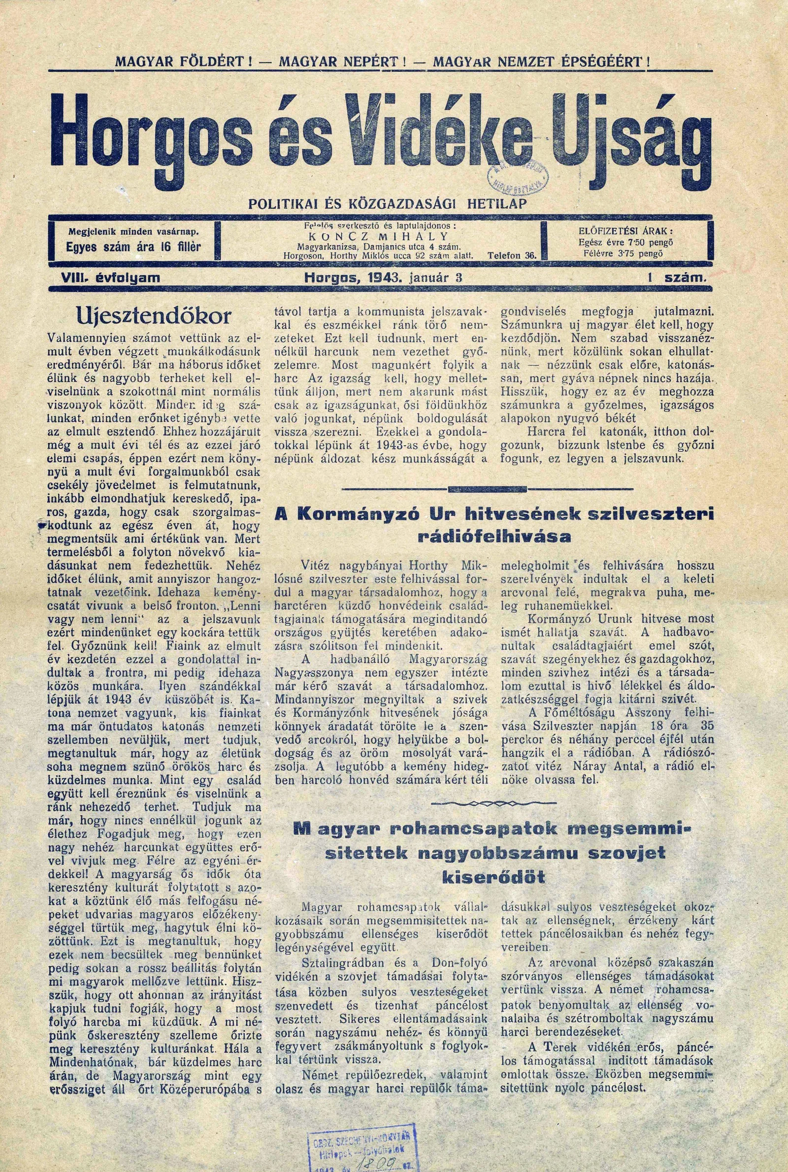 Horgos és vidéke, 8. évf. 1943. január 3. 1. sz.