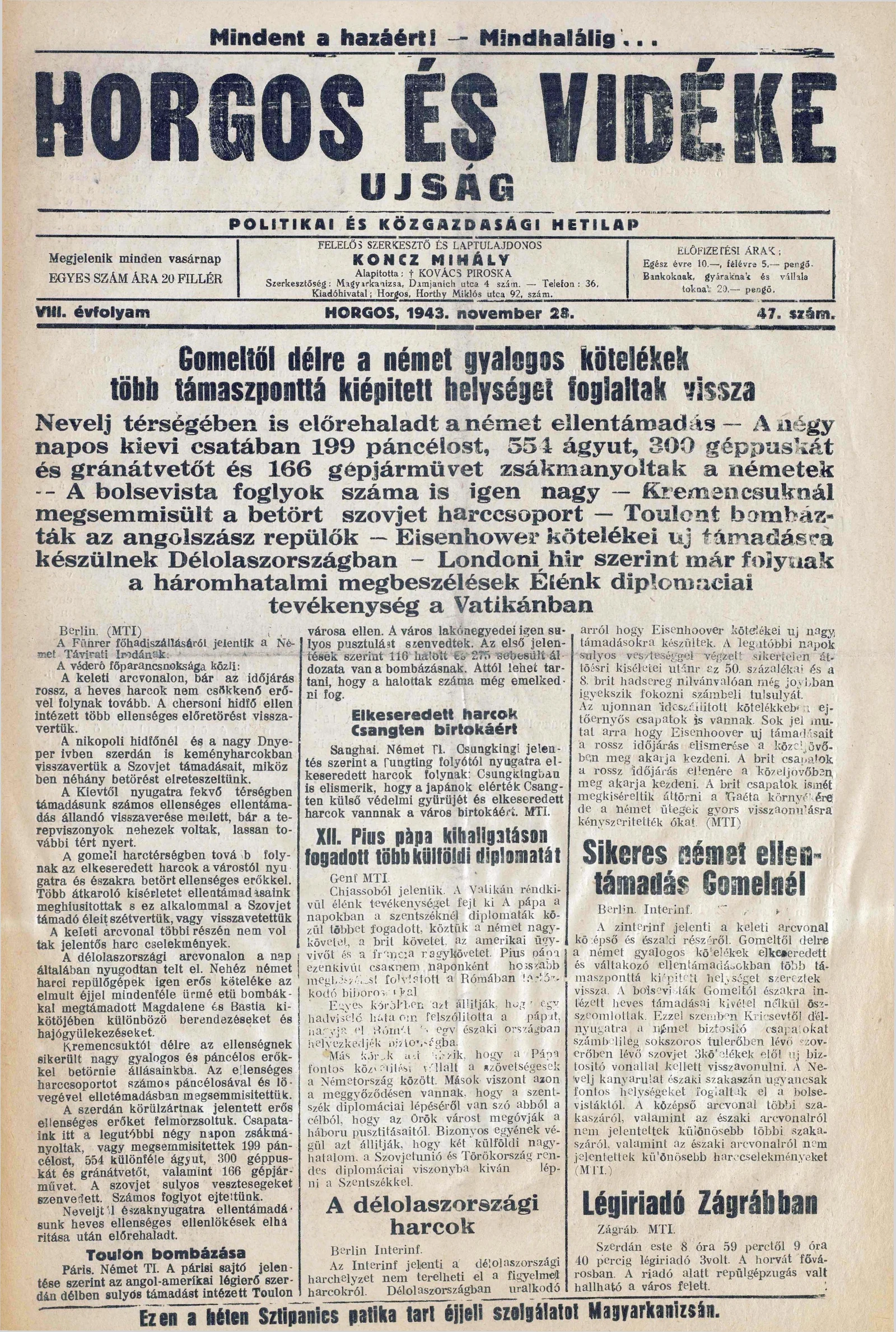 Horgos és vidéke, 8. évf. 1943. november 28. 47. sz.