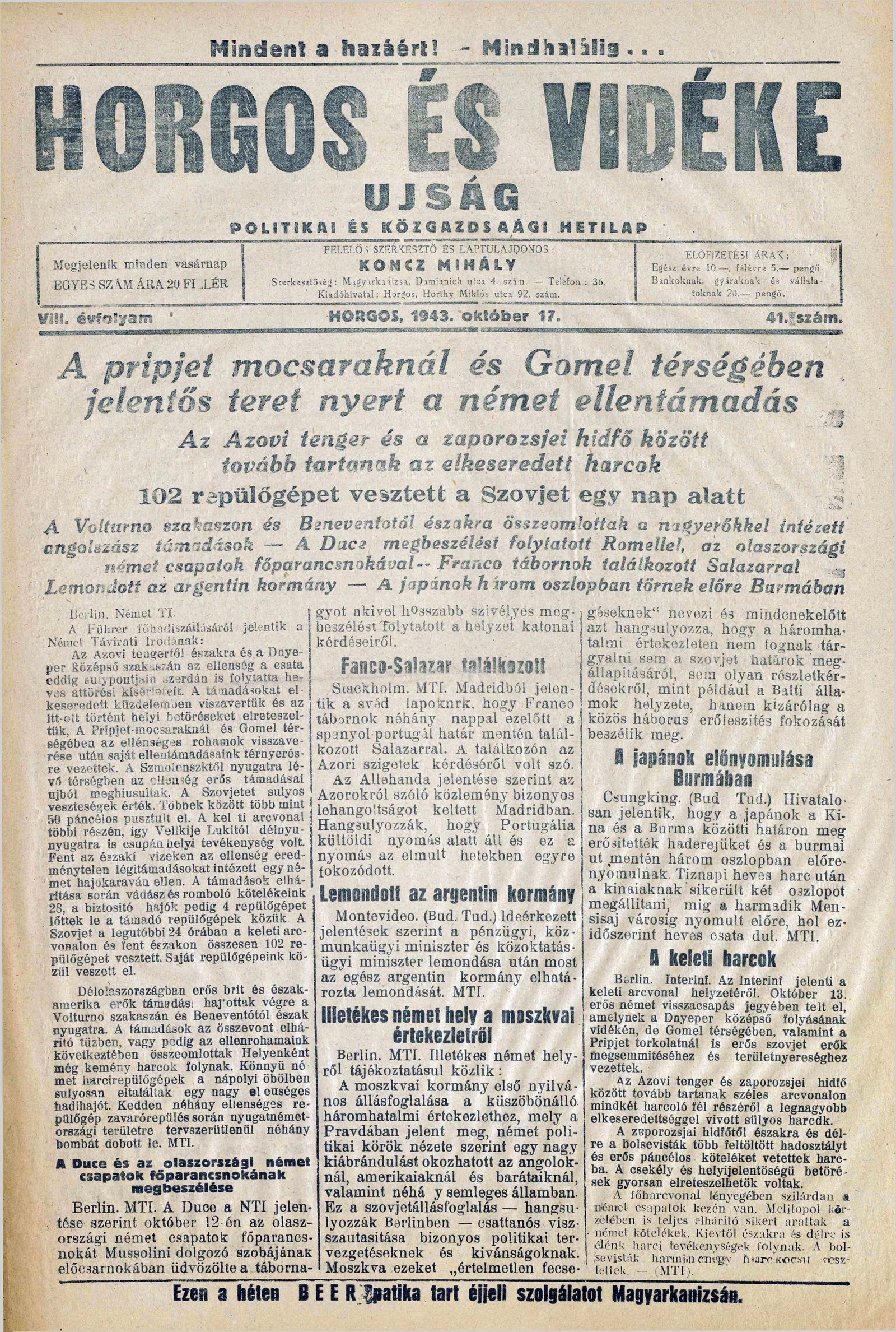 Horgos és vidéke, 8. évf. 1943. október 17. 41. sz.