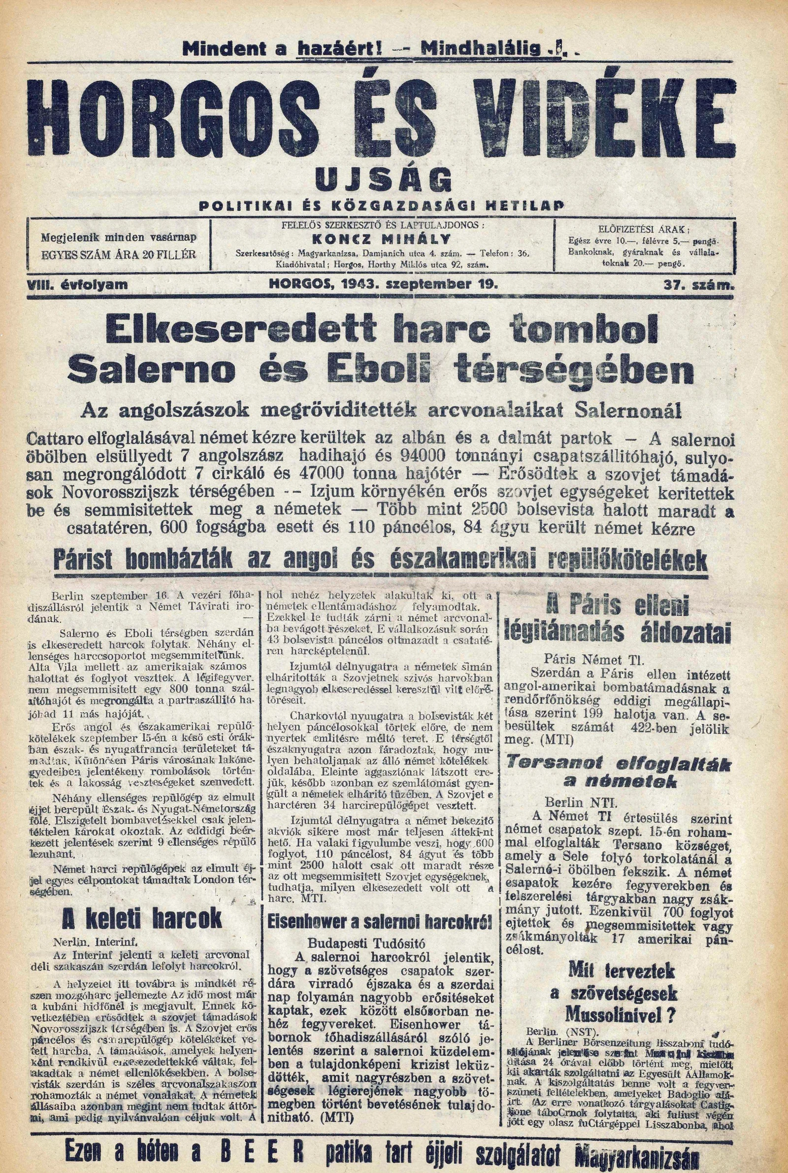 Horgos és vidéke, 8. évf. 1943. szeptember 19. 37. sz.