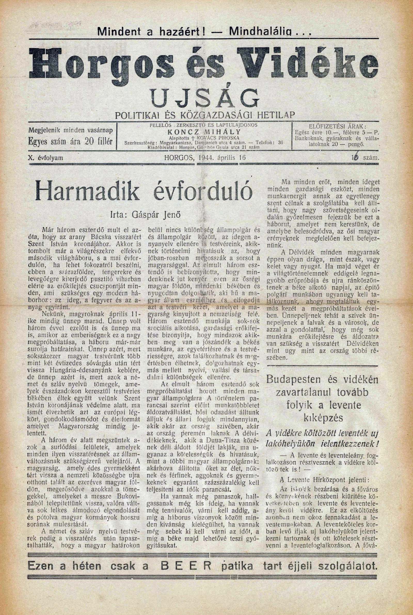 Horgos és vidéke, 9. évf. 1944. április 16. 16. sz.