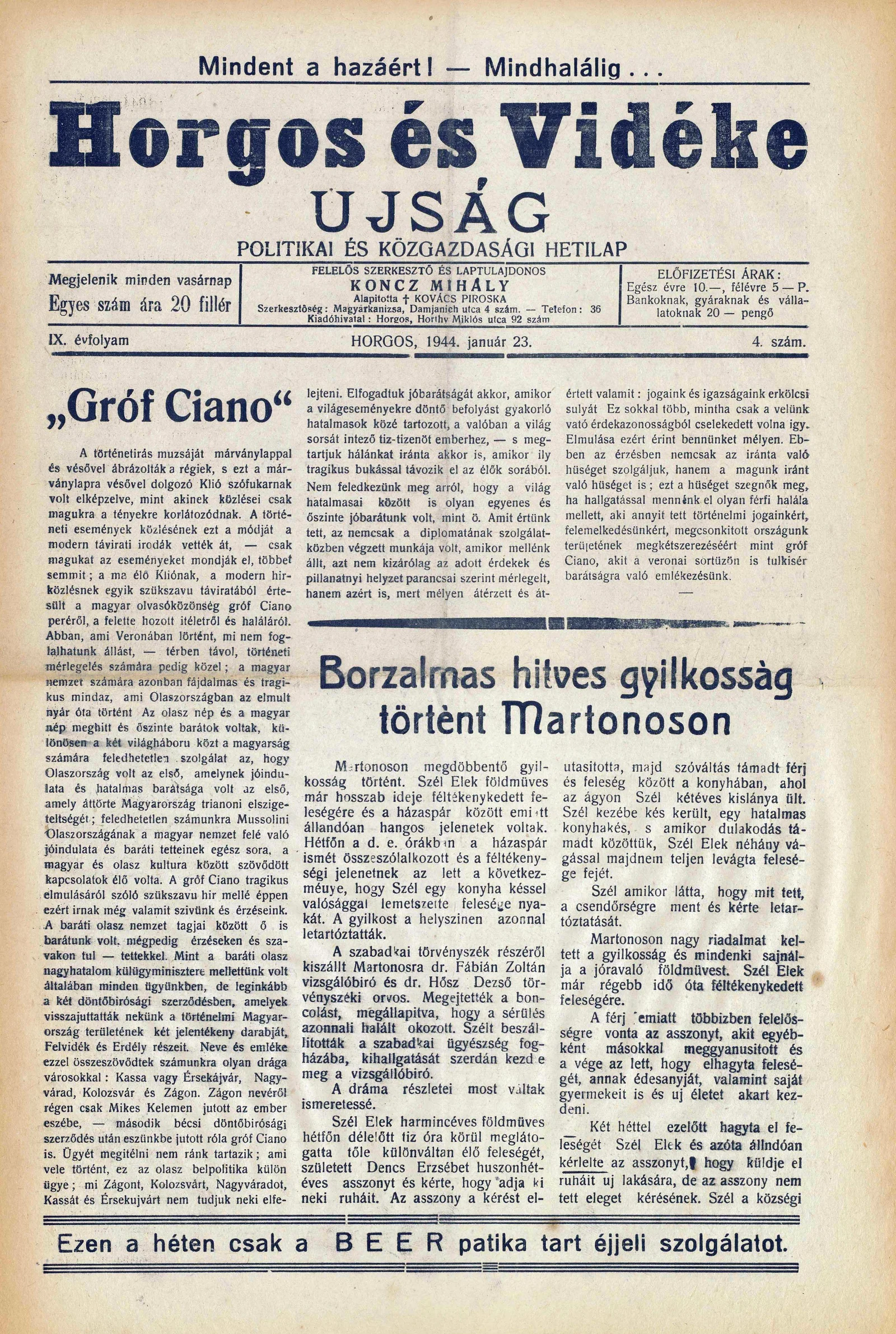 Horgos és vidéke, 9. évf. 1944. január 23. 4. sz.
