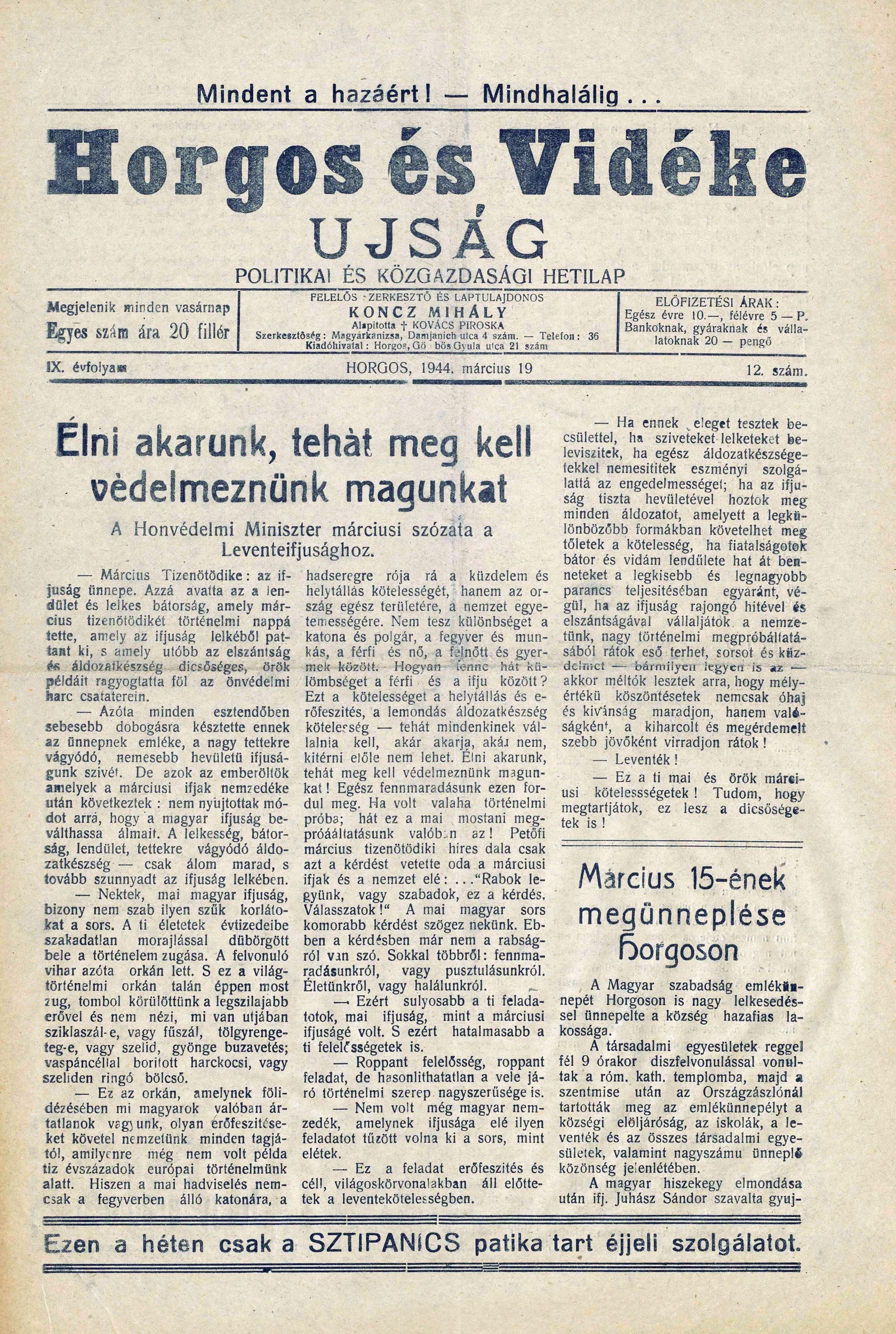 Horgos és vidéke, 9. évf. 1944. március 19. 12. sz.