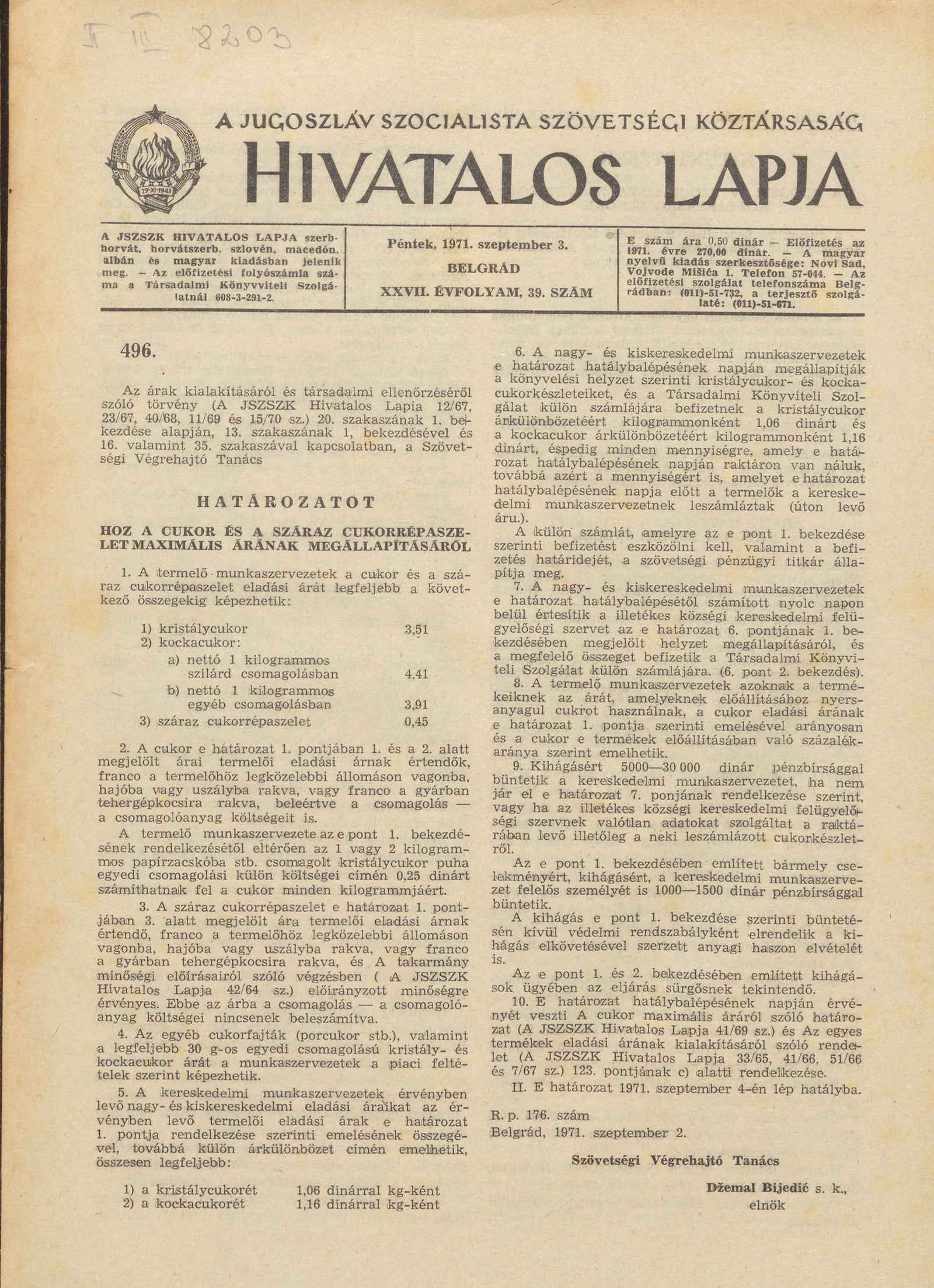 A Jugoszláv Szocialista Szövetségi Köztársaság Hivatalos Lapja, 27. évf. 1971. szeptember 3. 39. sz. 701–704. oldal