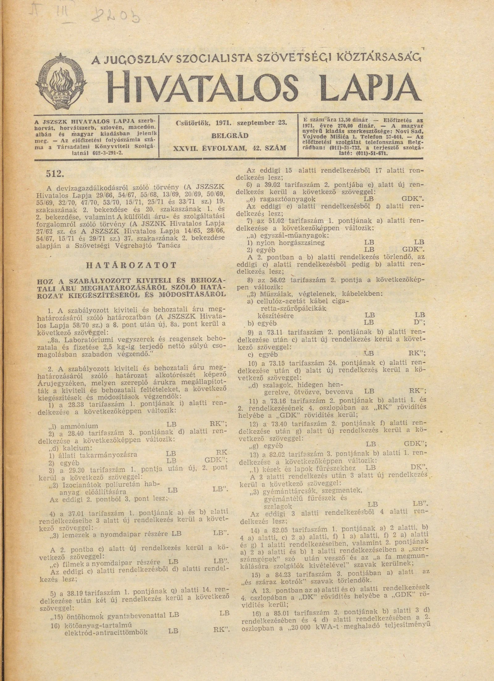 A Jugoszláv Szocialista Szövetségi Köztársaság Hivatalos Lapja, 27. évf. 1971. szeptember 23. 42. sz. 721–828. oldal