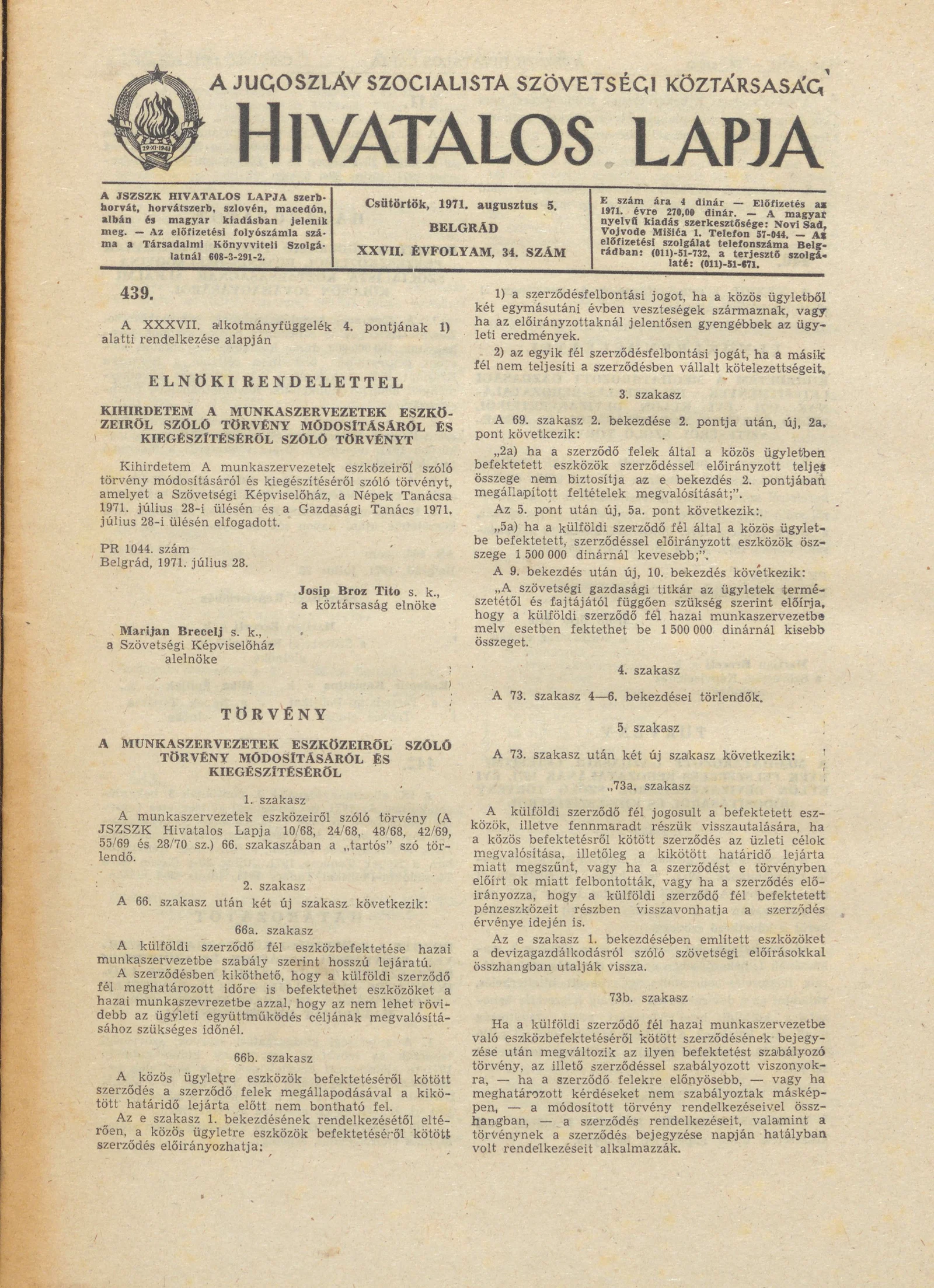 A Jugoszláv Szocialista Szövetségi Köztársaság Hivatalos Lapja, 27. évf. 1971. augusztus 5. 34. sz. 649–660. oldal