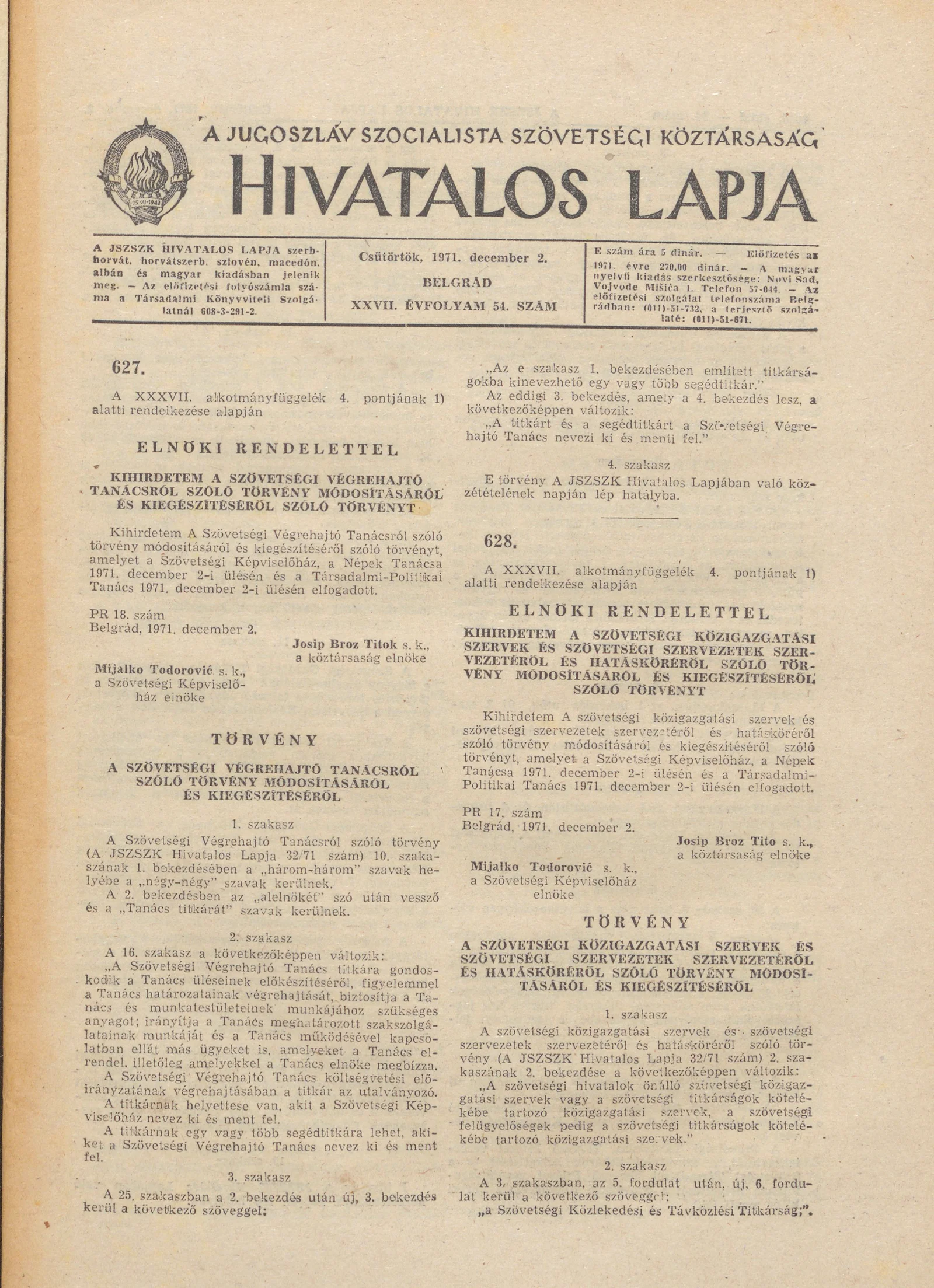 A Jugoszláv Szocialista Szövetségi Köztársaság Hivatalos Lapja, 27. évf. 1971. december 2. 54. sz. 1025–1032. oldal