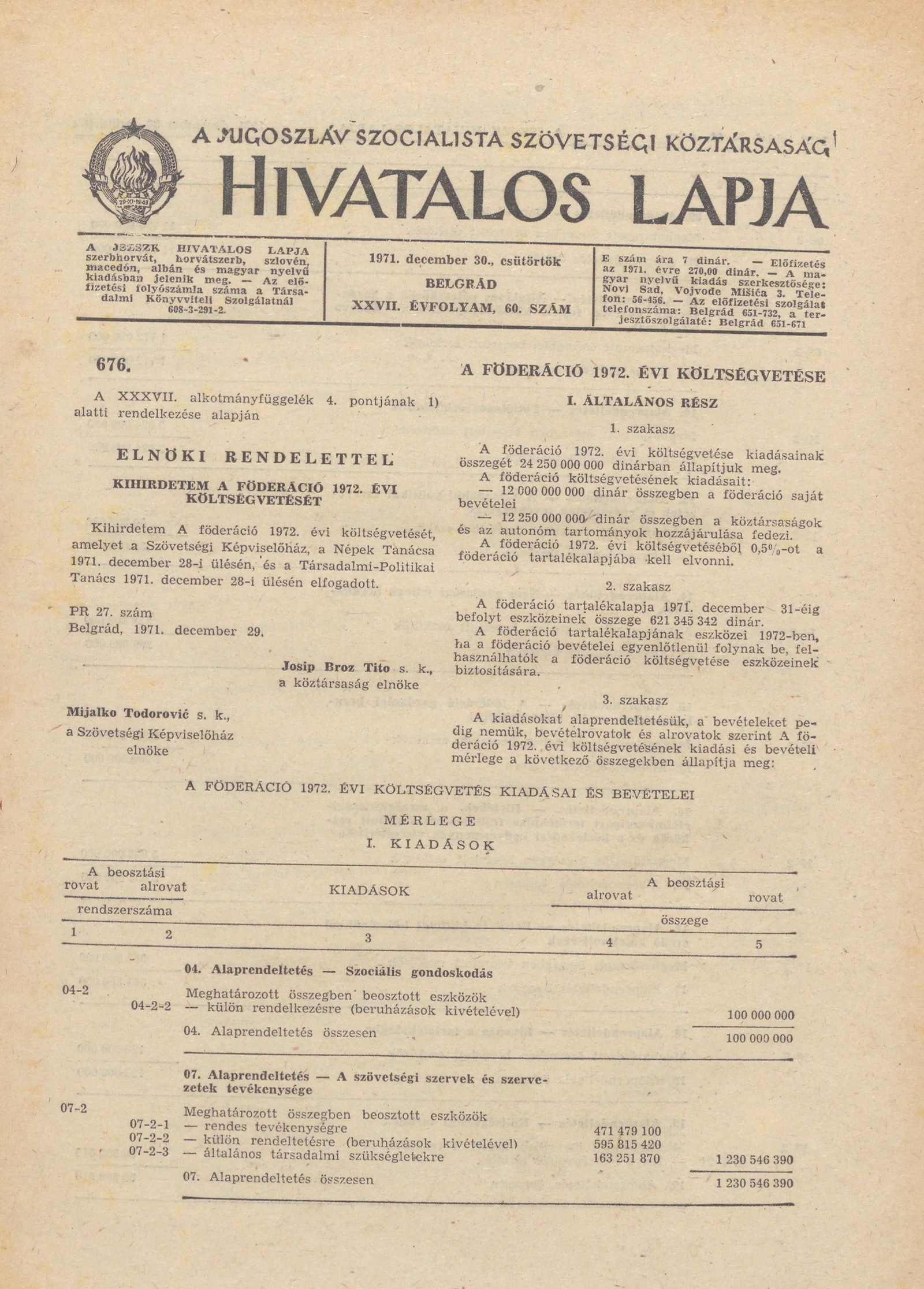 A Jugoszláv Szocialista Szövetségi Köztársaság Hivatalos Lapja, 27. évf. 1971. december 30. 60. sz. 1121–1176. oldal