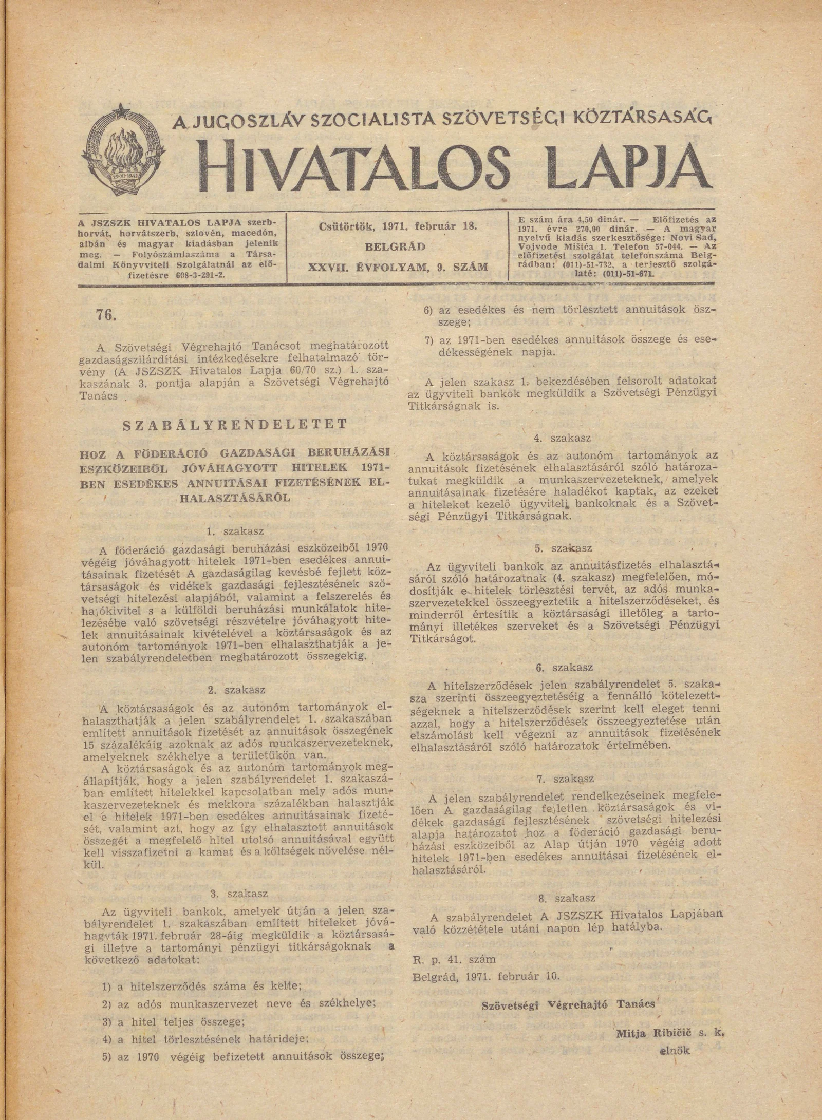 - Szabályrendelet a föderáció gazdasági beruházási eszközeiből jóváhagyott hitelek 1971-ben esedékes annuitásai fizetésének elhalasztásáról173