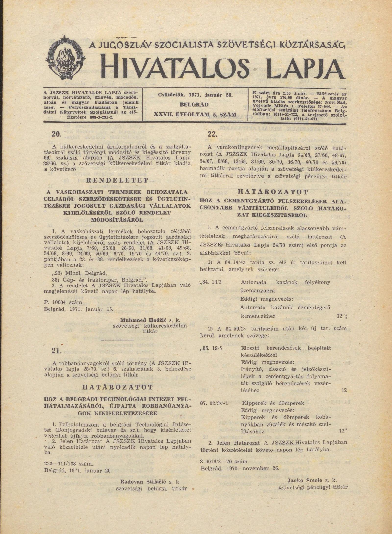 A Jugoszláv Szocialista Szövetségi Köztársaság Hivatalos Lapja, 27. évf. 1971. január 28. 5. sz. 57–66. oldal