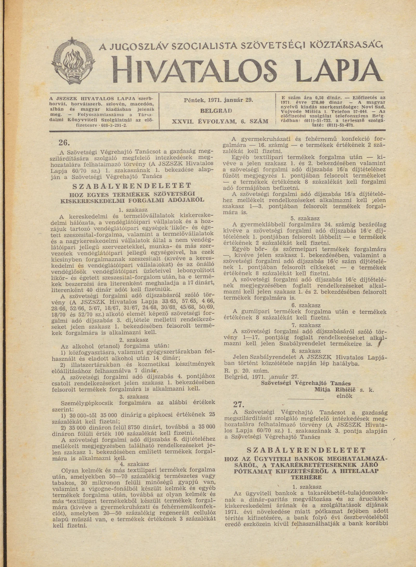 A Jugoszláv Szocialista Szövetségi Köztársaság Hivatalos Lapja, 27. évf. 1971. január 29. 6. sz. 69–72. oldal