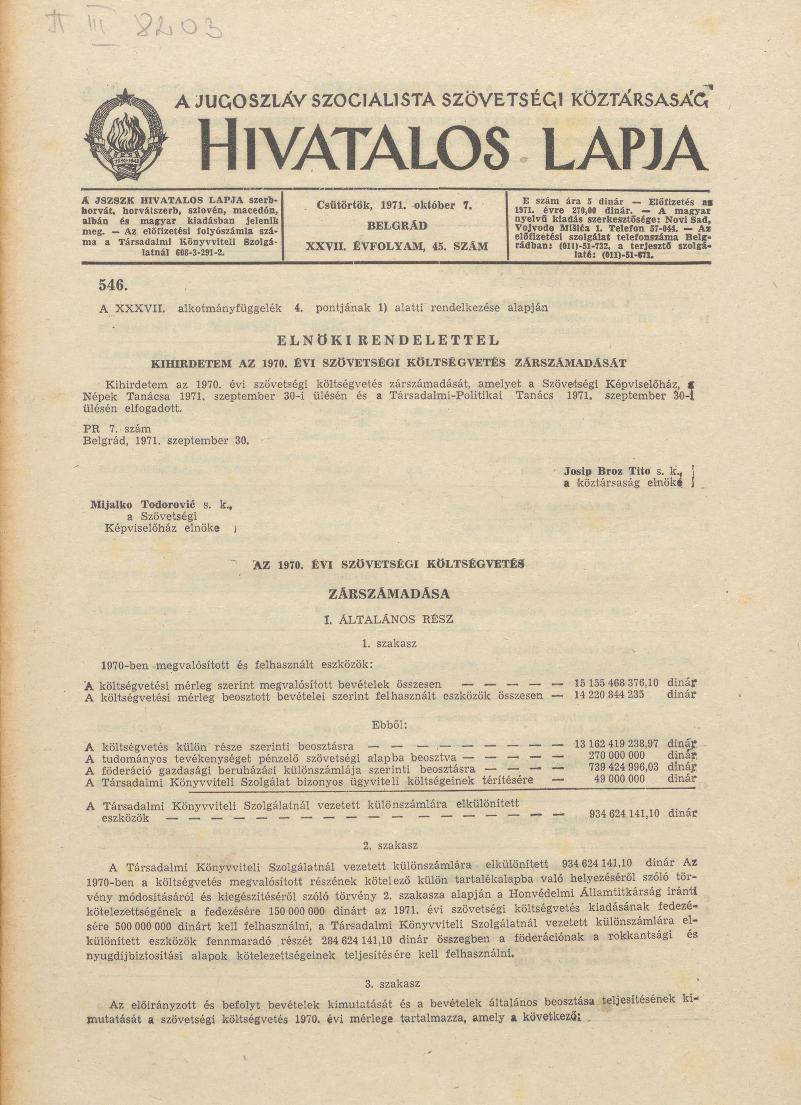 - Az 1970. évi szövetségi költségvetés zárszámadása 845