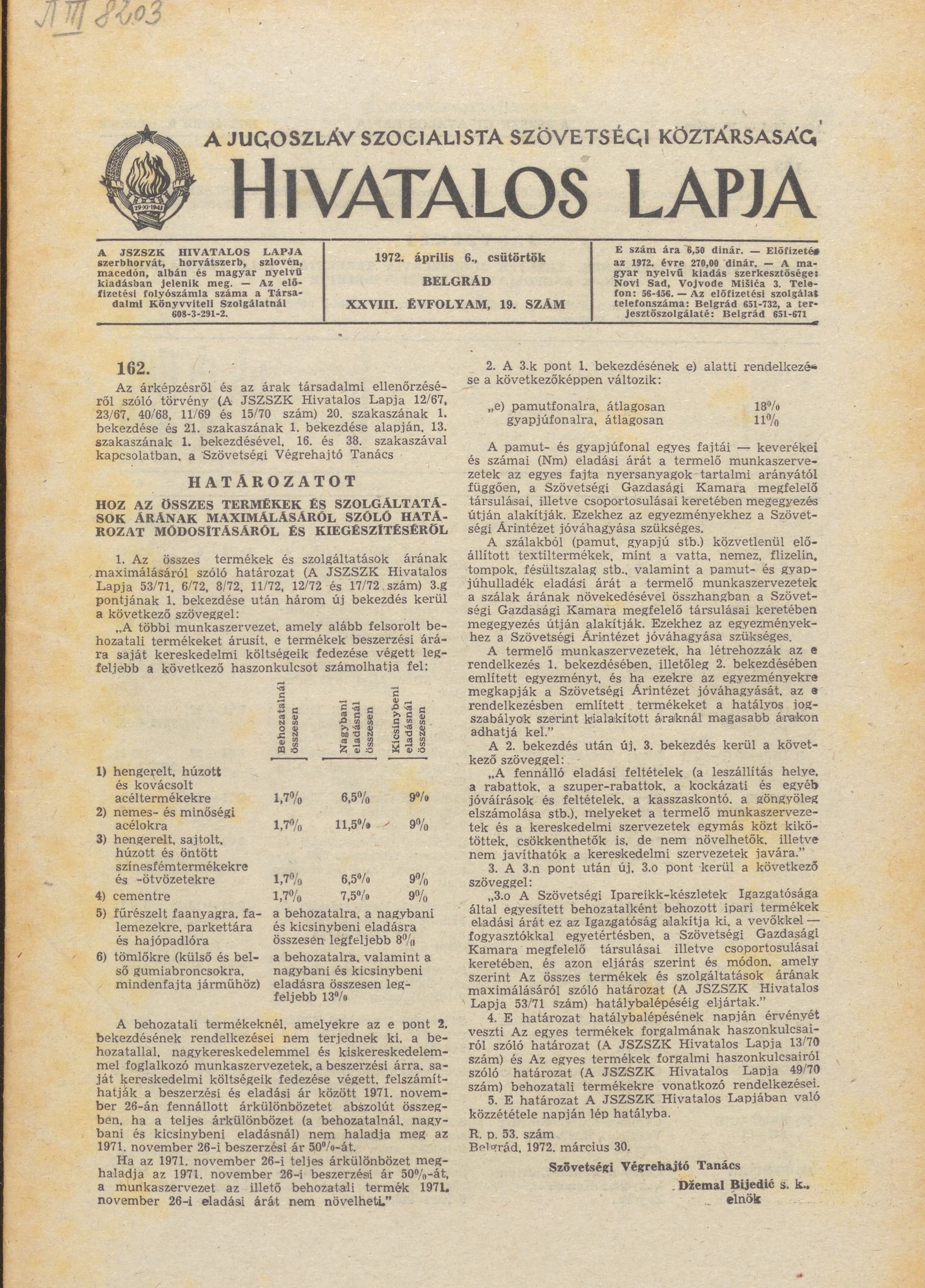 - Határozat az összes termékek és szolgáltatások árának maximálásáról szóló határozat kiegészítéséről385