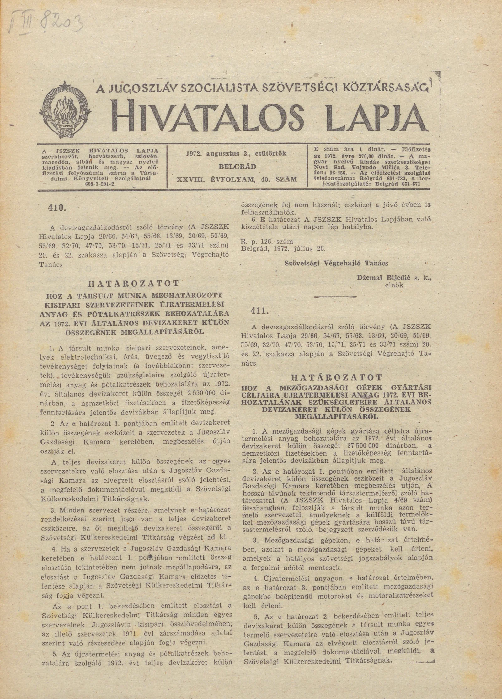 A Jugoszláv Szocialista Szövetségi Köztársaság Hivatalos Lapja, 28. évf. 1972. augusztus 3. 40. sz. 849–856. oldal
