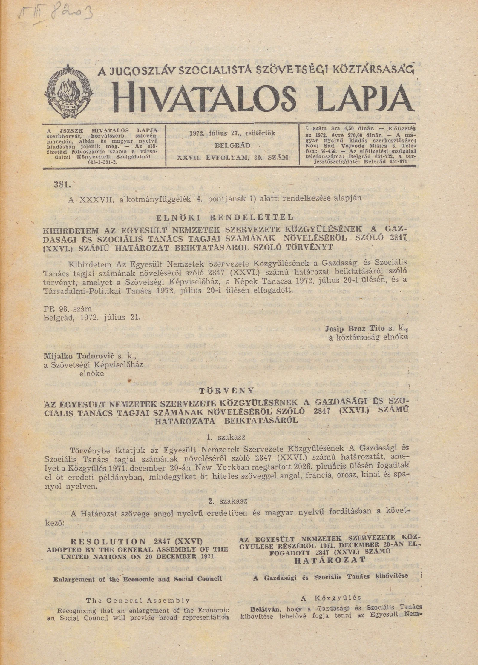 A Jugoszláv Szocialista Szövetségi Köztársaság Hivatalos Lapja, 28. évf. 1972. július 27. 39. sz. 817–848. oldal