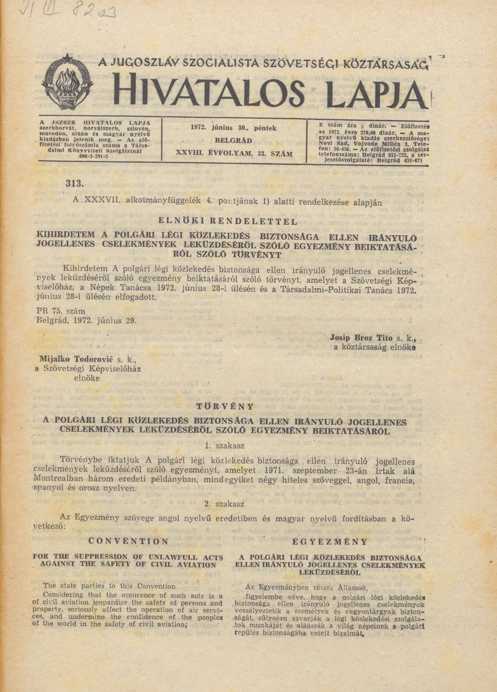 - Törvény a polgári légi közlekedés biztonsága ellen irányuló jogellenes cselekmények leküzdéséről szóló egyezmény beiktatásáról625