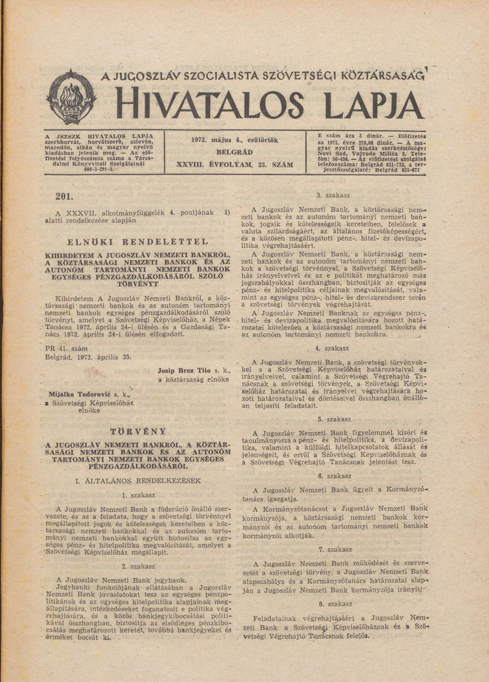 A Jugoszláv Szocialista Szövetségi Köztársaság Hivatalos Lapja, 28. évf. 1972. május 4. 23. sz. 429–456. oldal