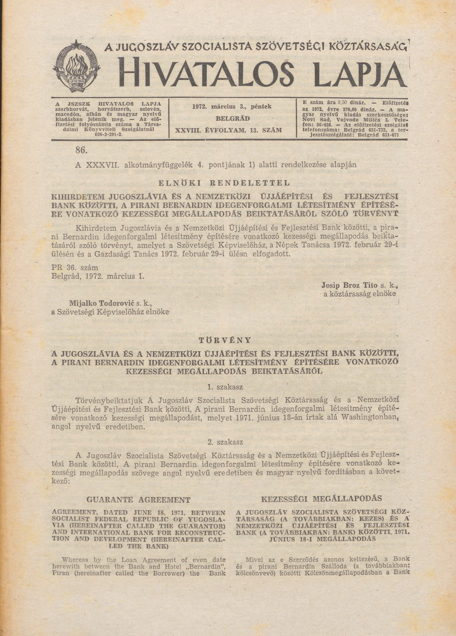 - Törvény A Jugoszlávia és a Nemzetközi Újjáépítési és Fejlesztési Bank közötti, A pirani Bernardin idegenforgalmi létesítmény építésére vonatkozó kezességi megállapodás beiktatásáról265