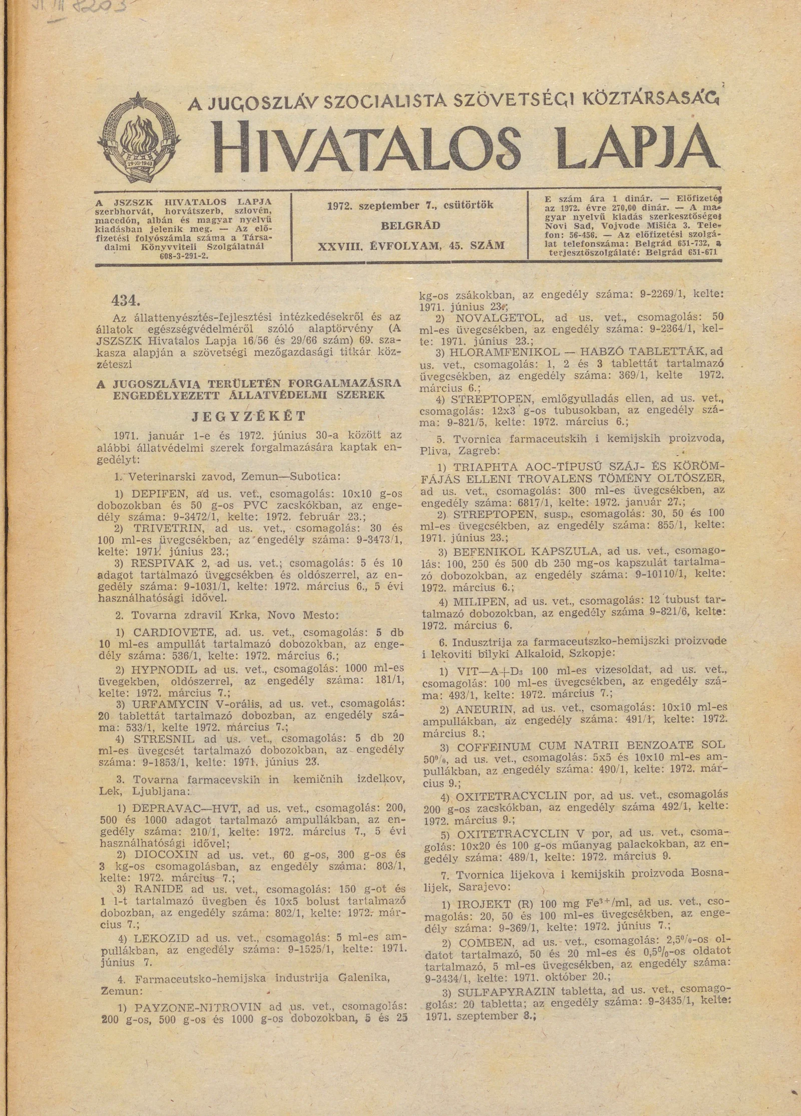 - Jegyzéke a Jugoszlávia területén forgalmazásra engedélyezett állatvédelmi szereknek 873