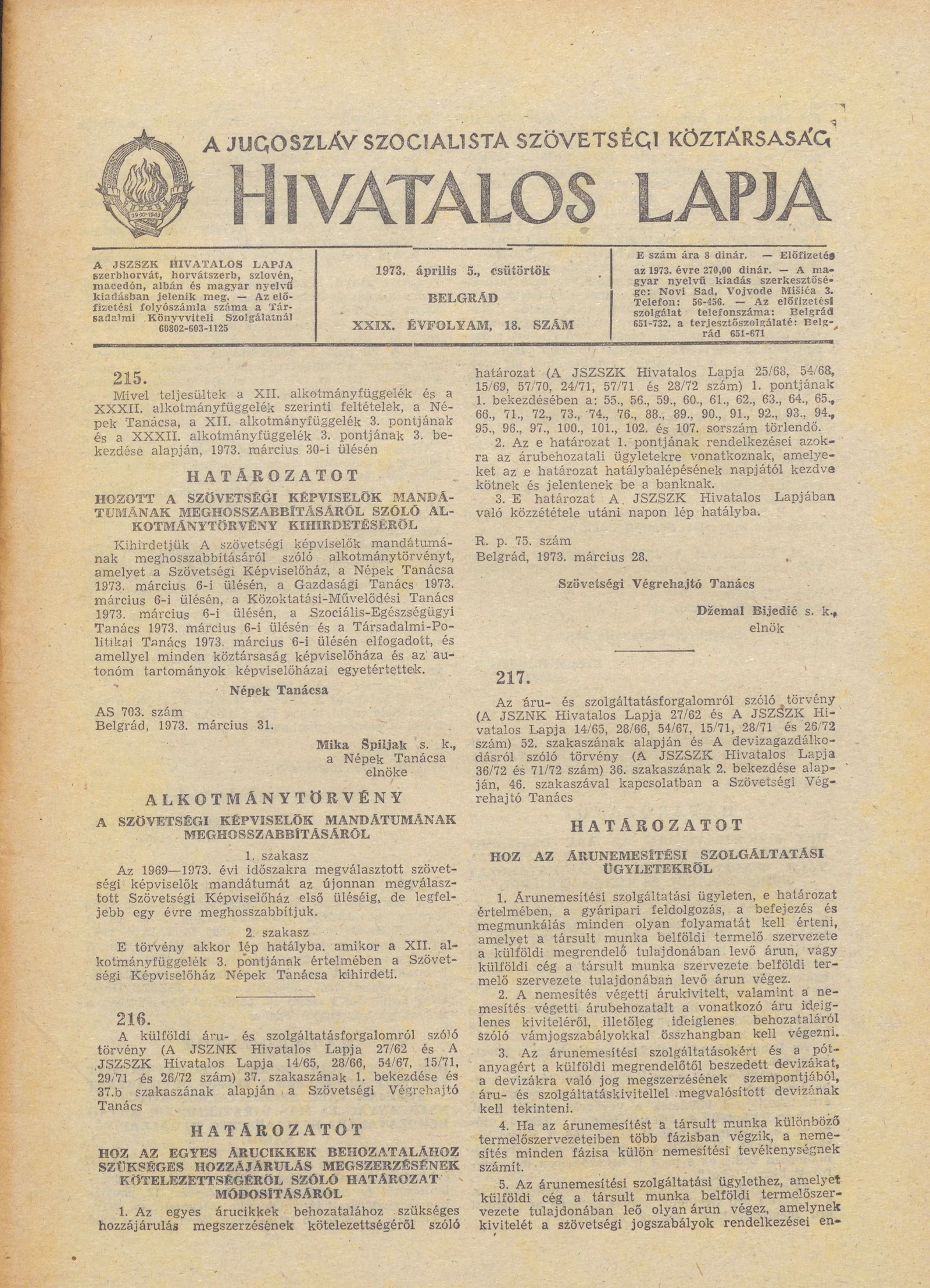 A Jugoszláv Szocialista Szövetségi Köztársaság Hivatalos Lapja, 29. évf. 1973. április 5. 18. sz. 537–600. oldal