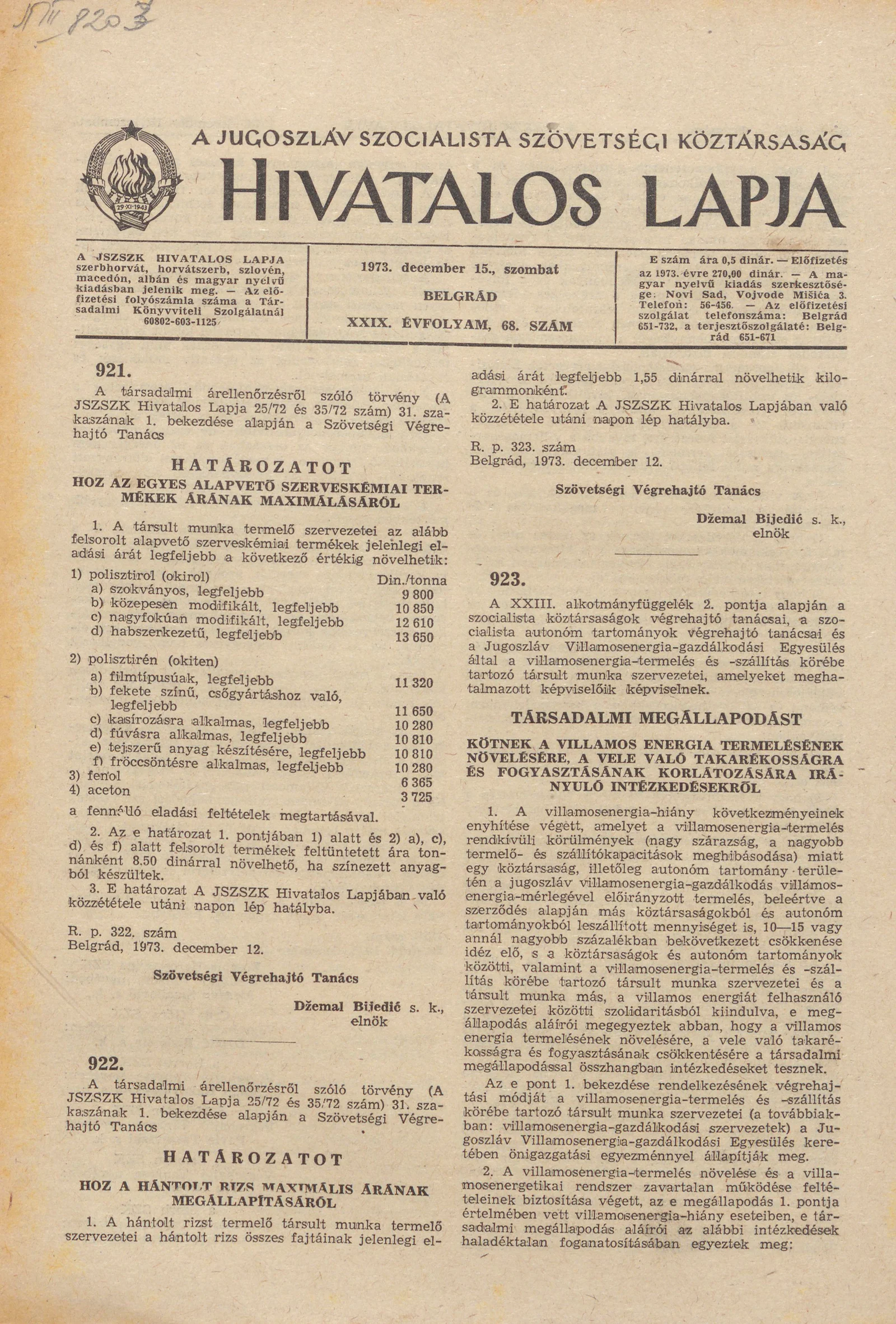 A Jugoszláv Szocialista Szövetségi Köztársaság Hivatalos Lapja, 29. évf. 1973. december 15. 68. sz. 2009–2012. oldal