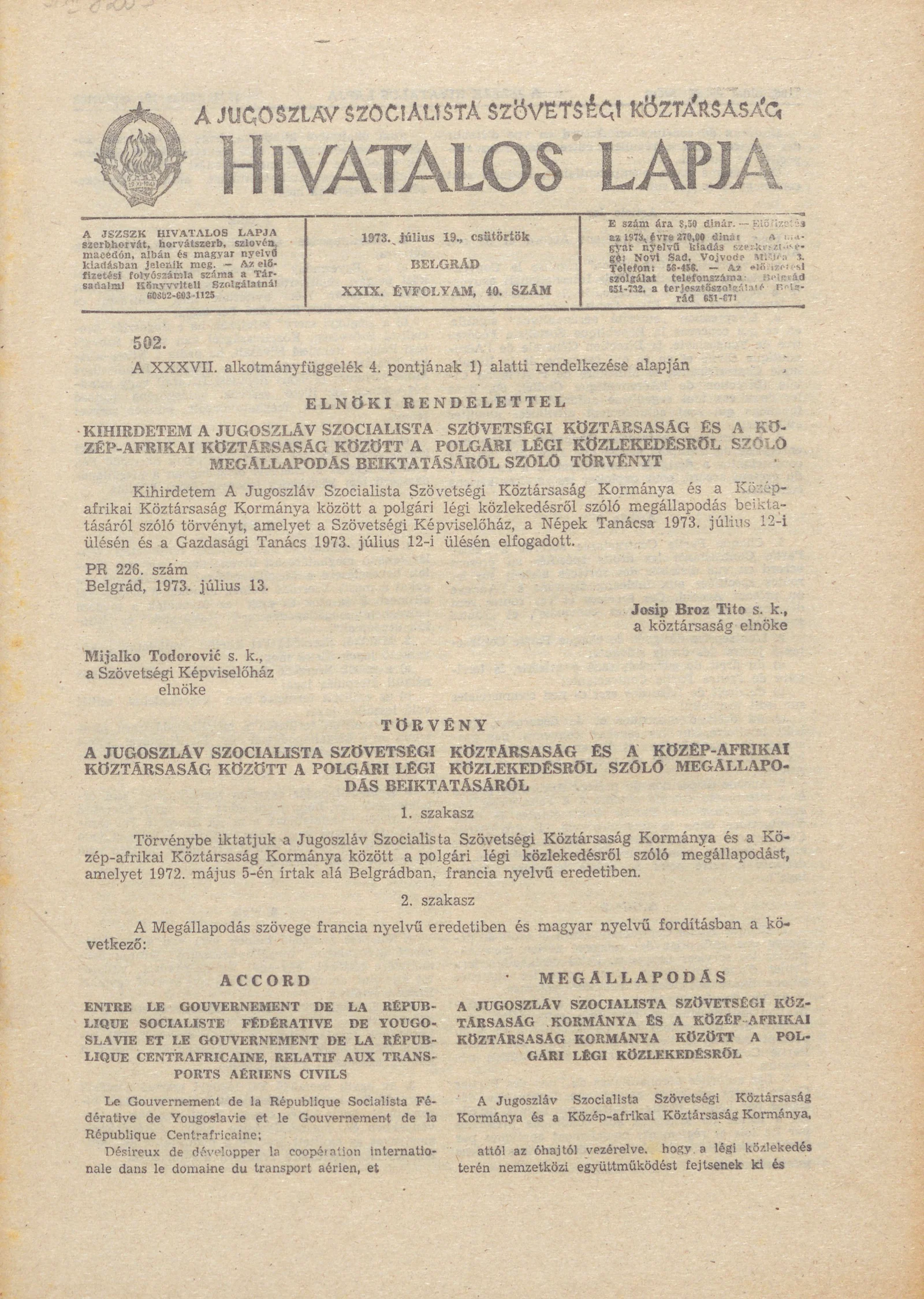 - Törvény A Jugoszláv Szocialista Szövetségi Köztársaság és a Közép-afrikai Köztársaság között a polgári légi közlekedésről szóló megállapodás beiktatásáról1185