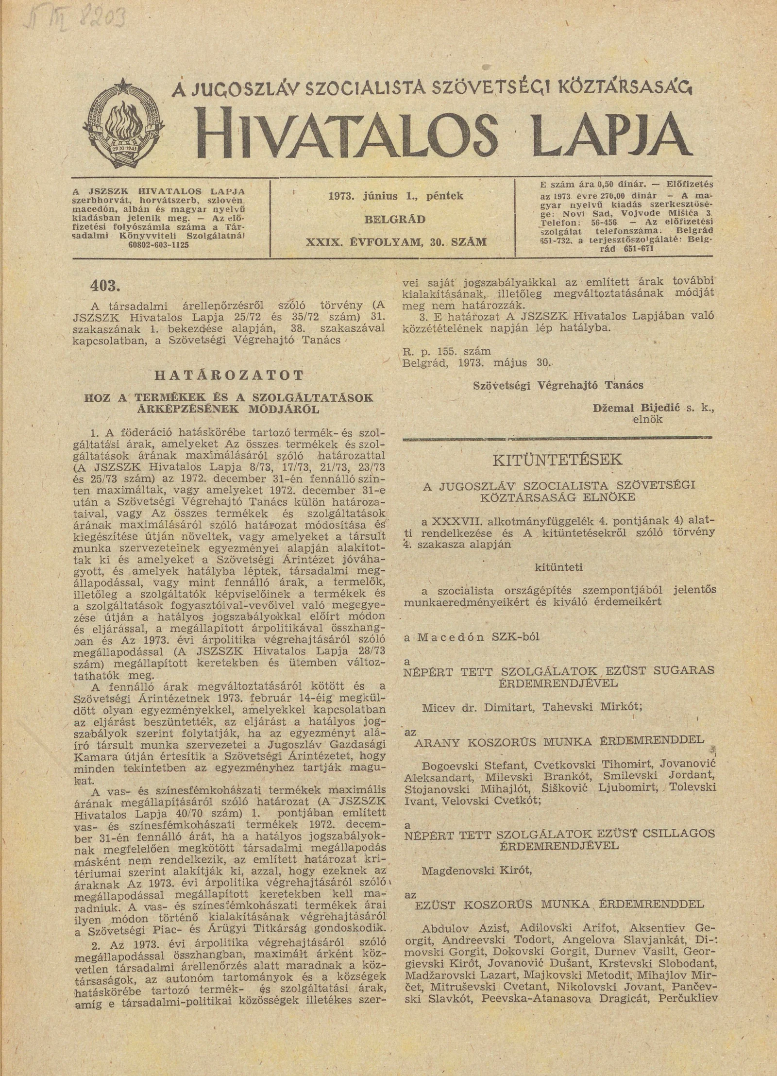 A Jugoszláv Szocialista Szövetségi Köztársaság Hivatalos Lapja, 29. évf. 1973. június 1. 30. sz. 941–944. oldal