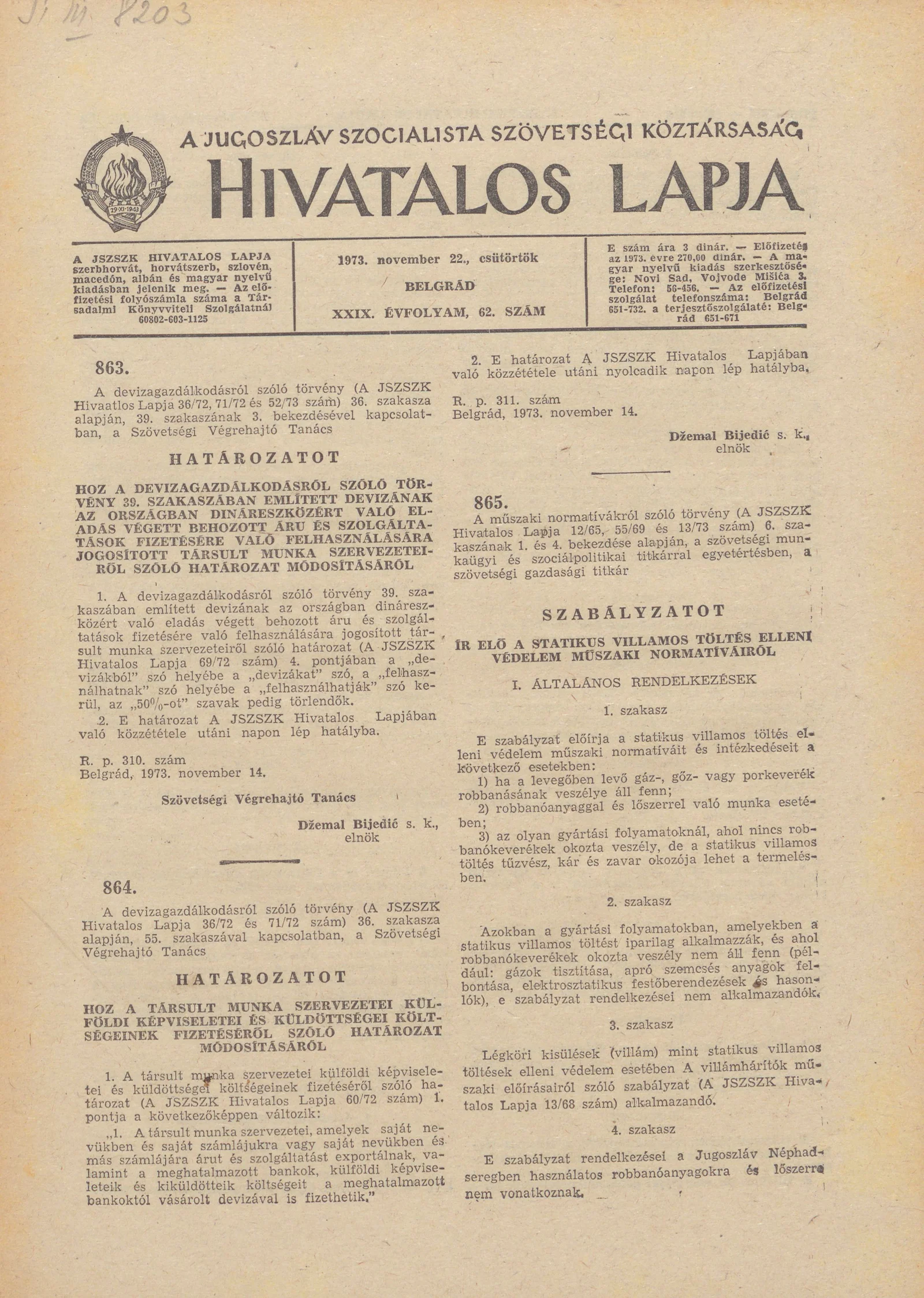 A Jugoszláv Szocialista Szövetségi Köztársaság Hivatalos Lapja, 29. évf. 1973. november 22. 62. sz. 1777–1796. oldal