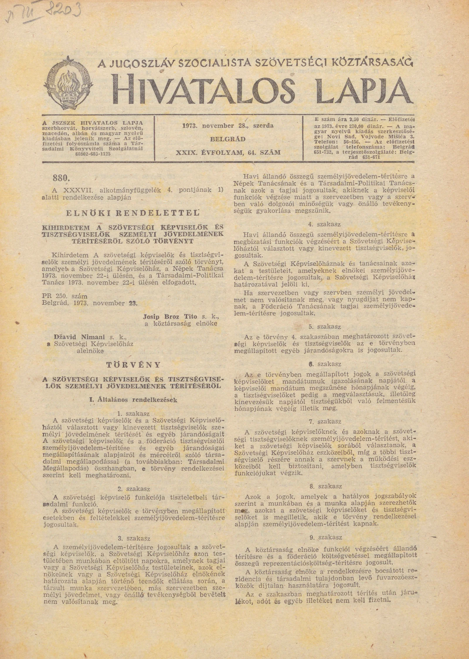 A Jugoszláv Szocialista Szövetségi Köztársaság Hivatalos Lapja, 29. évf. 1973. november 28. 64. sz. 1801–1820. oldal