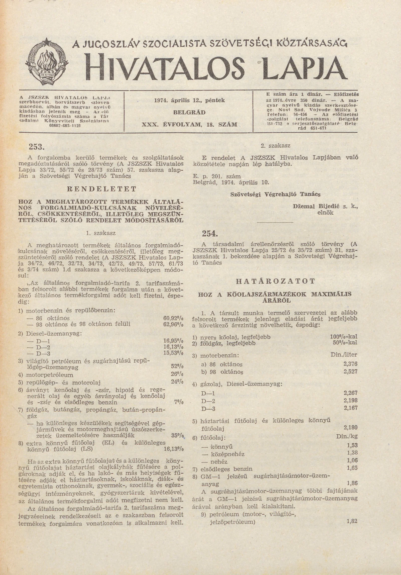 A Jugoszláv Szocialista Szövetségi Köztársaság Hivatalos Lapja, 30. évf. 1974. április 18. 19. sz. 501–548. oldal