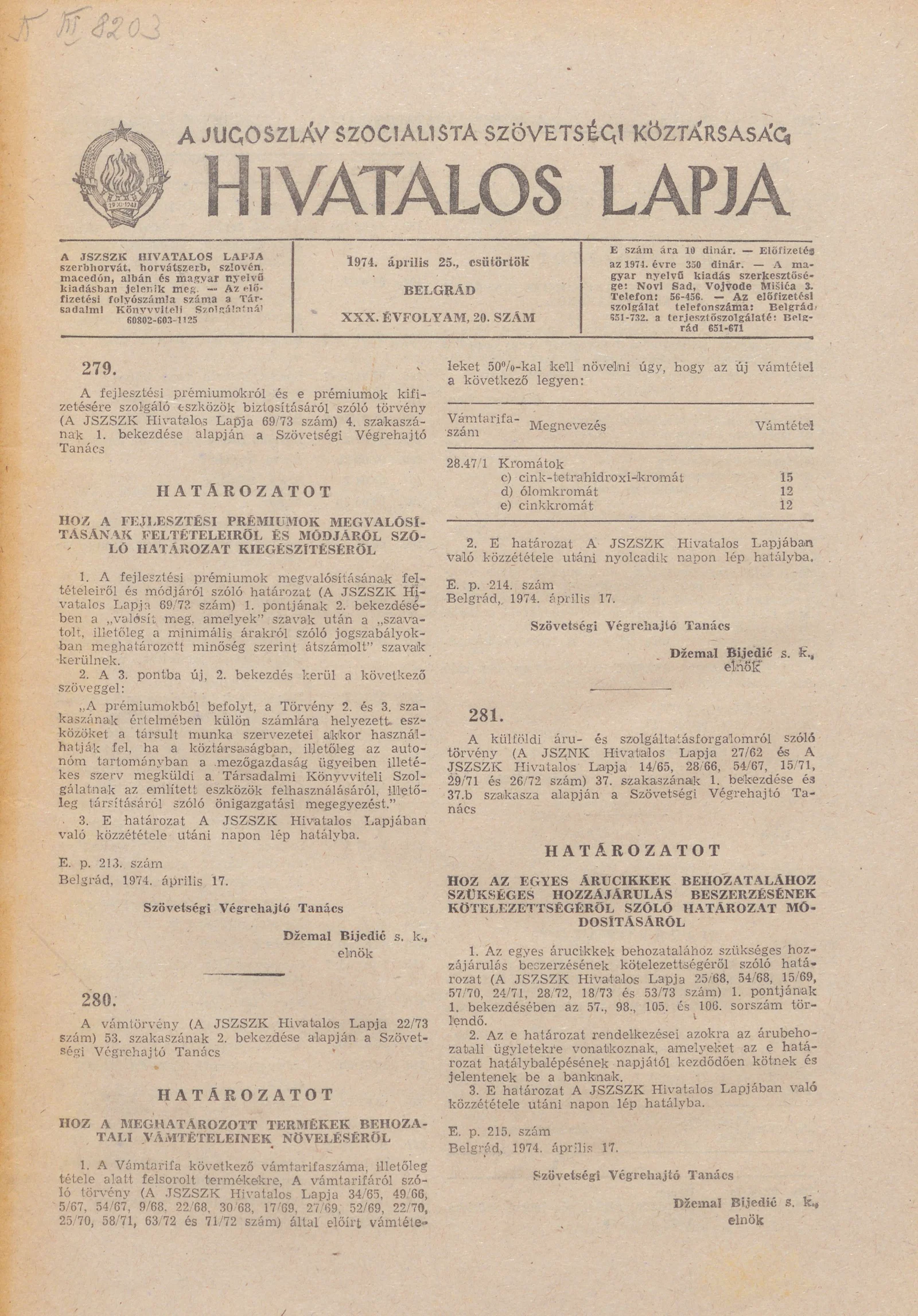 - Határozat a meghatározott termékek behozatali vámtételeinek növeléséről549