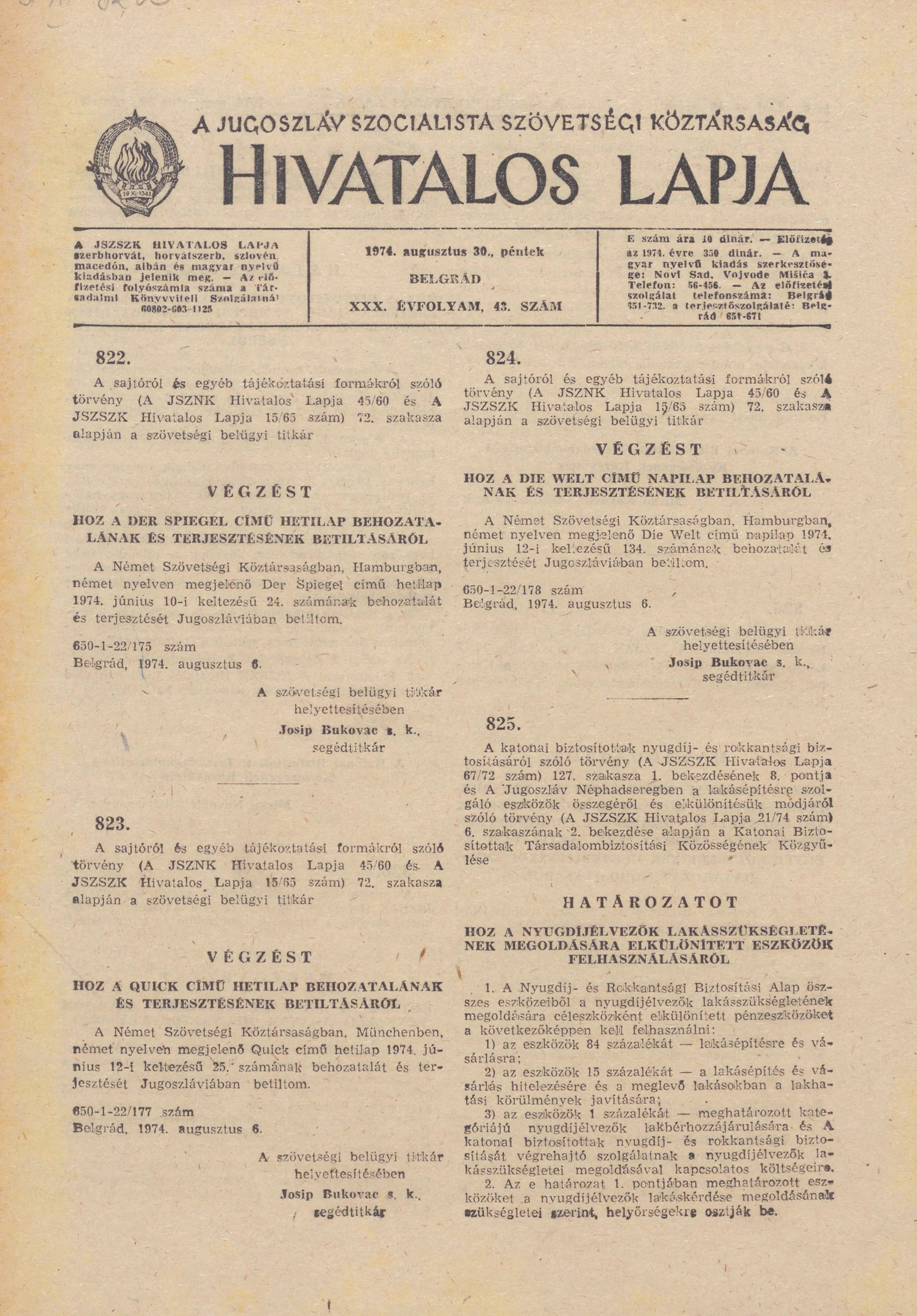 A Jugoszláv Szocialista Szövetségi Köztársaság Hivatalos Lapja, 30. évf. 1974. augusztus 30. 43. sz. 1417–1428. oldal