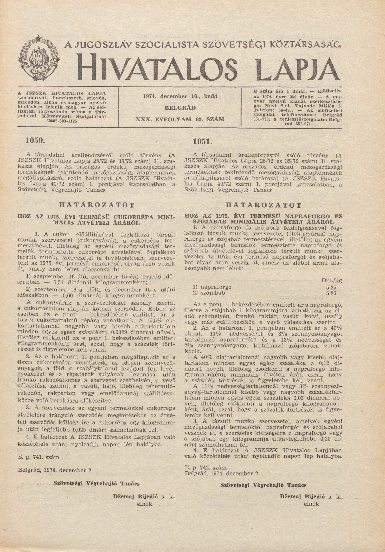 A Jugoszláv Szocialista Szövetségi Köztársaság Hivatalos Lapja, 30. évf. 1974. december 10. 63. sz. 1893–1896. oldal