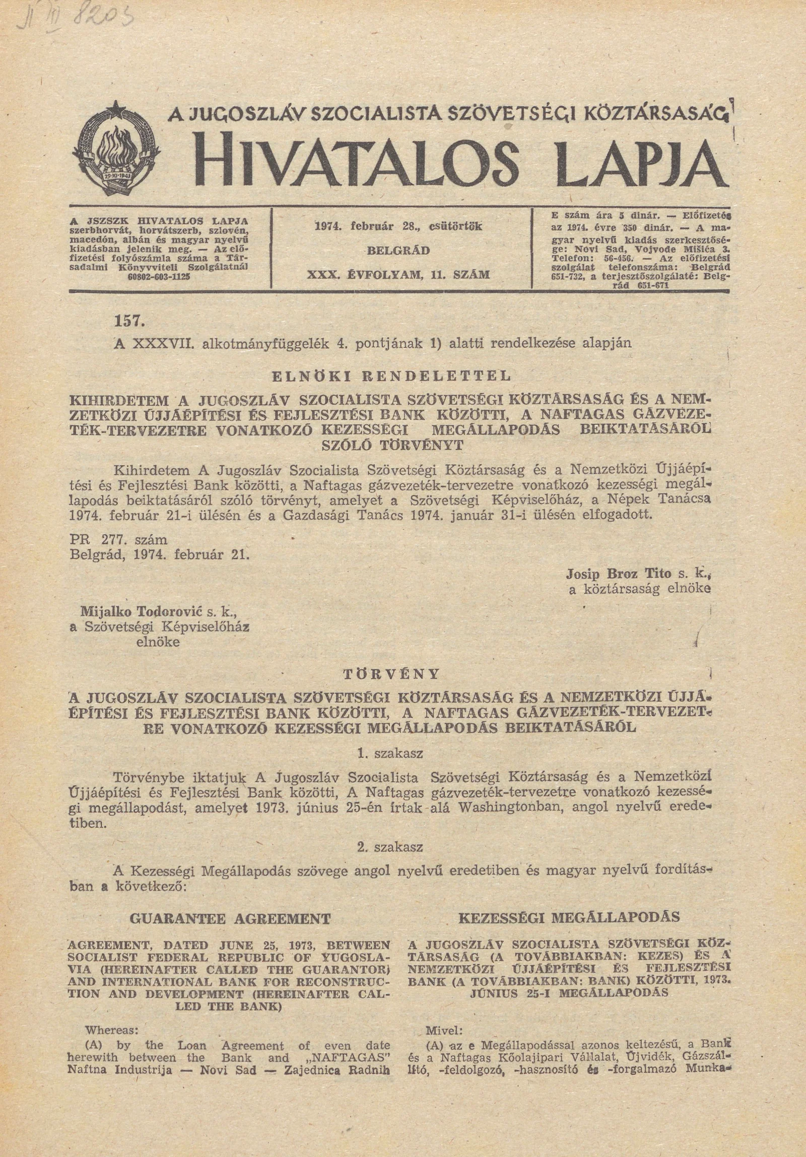 - Törvény a Jugoszláv Szocialista Szövetségi Köztársaság és a Nemzetközi Újjáépítési és Fejlesztési Bank közötti, a Naftagas gázvezeték-tervezetre vonatkozó kezességi megállapodás beiktatásáról285