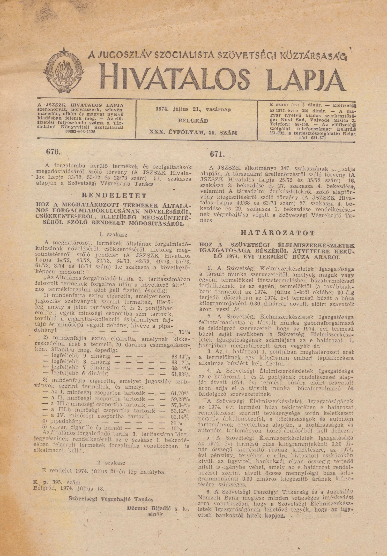 A Jugoszláv Szocialista Szövetségi Köztársaság Hivatalos Lapja, 30. évf. 1974. július 21. 36. sz. 1217–1228. oldal