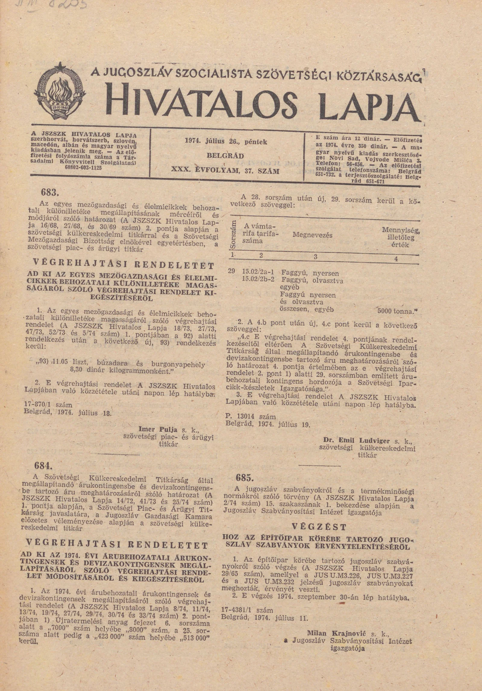 A Jugoszláv Szocialista Szövetségi Köztársaság Hivatalos Lapja, 30. évf. 1974. július 26. 37. sz. 1229–1276. oldal