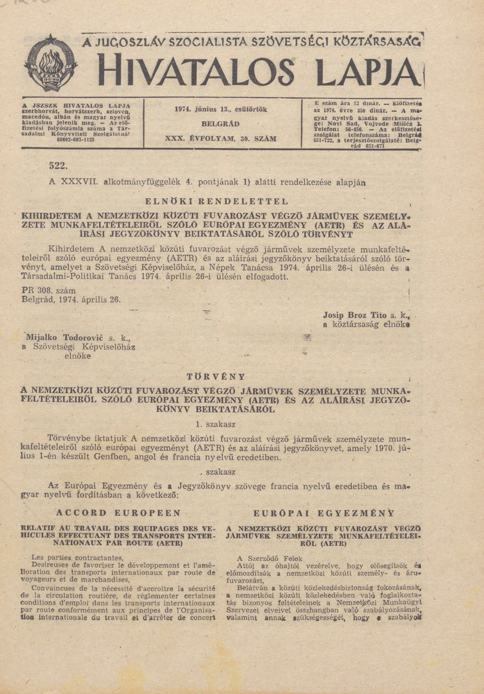 - Törvény a nemzetközi közúti fuvarozást végző járművek személyzete munkafeltételeiről szóló európai egyezmény (AETR) és az aláírási jegyzőkönyv beiktatásáról1029